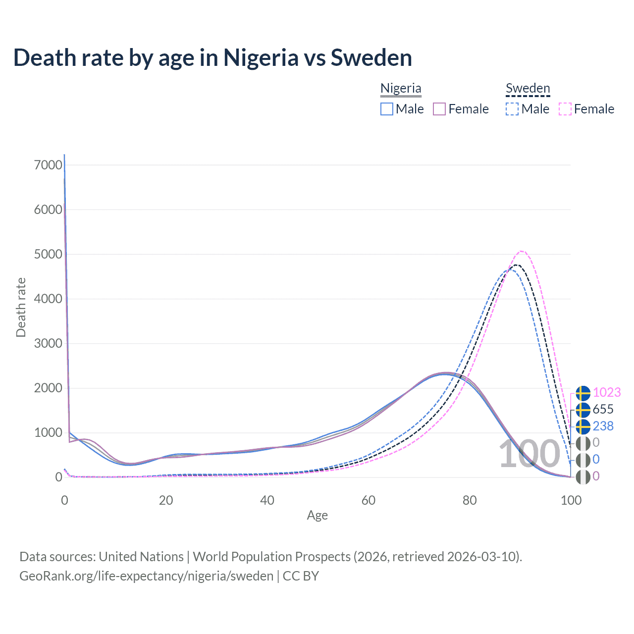 In Nigeria, the most common age of death is 0, compared to 89 in Sweden. The median age of death is 64.3 in Nigeria and 86.5 in Sweden, meaning only half of each cohort is expected to live past that age.
