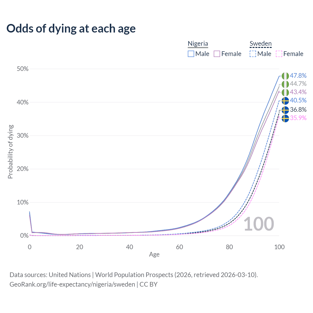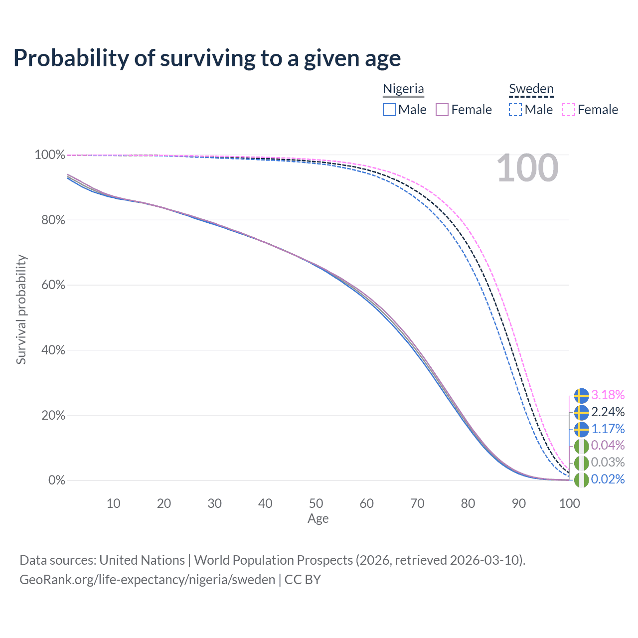 This life expectancy calculator shows the odds of living to 100, 95, 90, and below based on current age for both males and females in Nigeria and Sweden, along with mean and median age of death. The calculations are based on the 2026 life tables (actuarial tables) from the UN World Population Prospects.