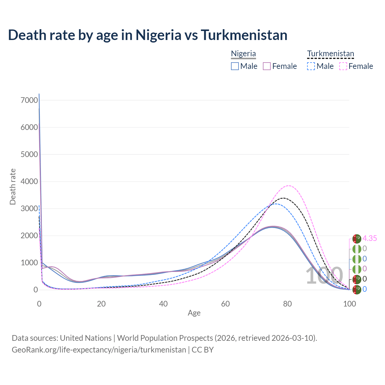 In Nigeria, the most common age of death is 0, compared to 79 in Turkmenistan. The median age of death is 64.3 in Nigeria and 75.1 in Turkmenistan, meaning only half of each cohort is expected to live past that age.