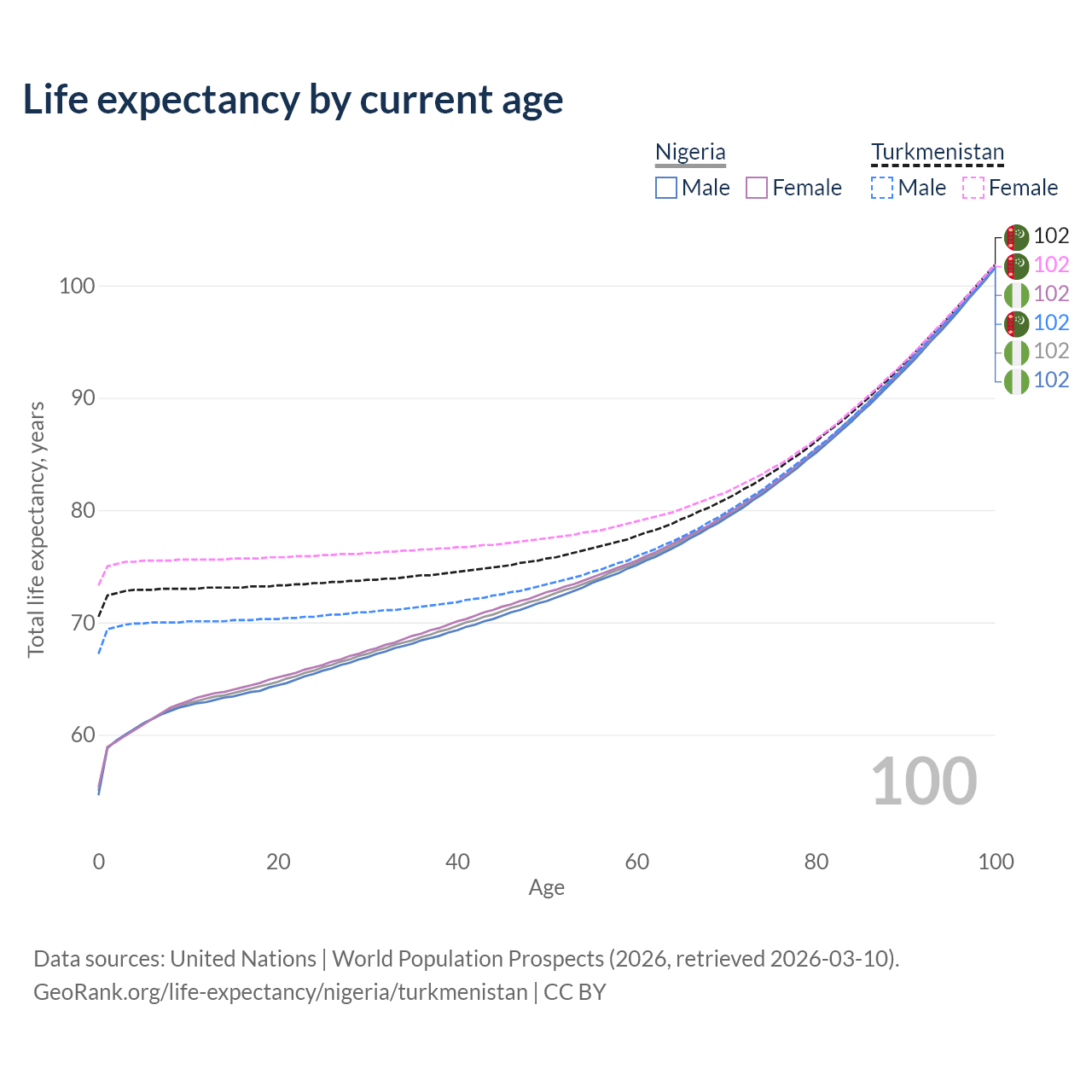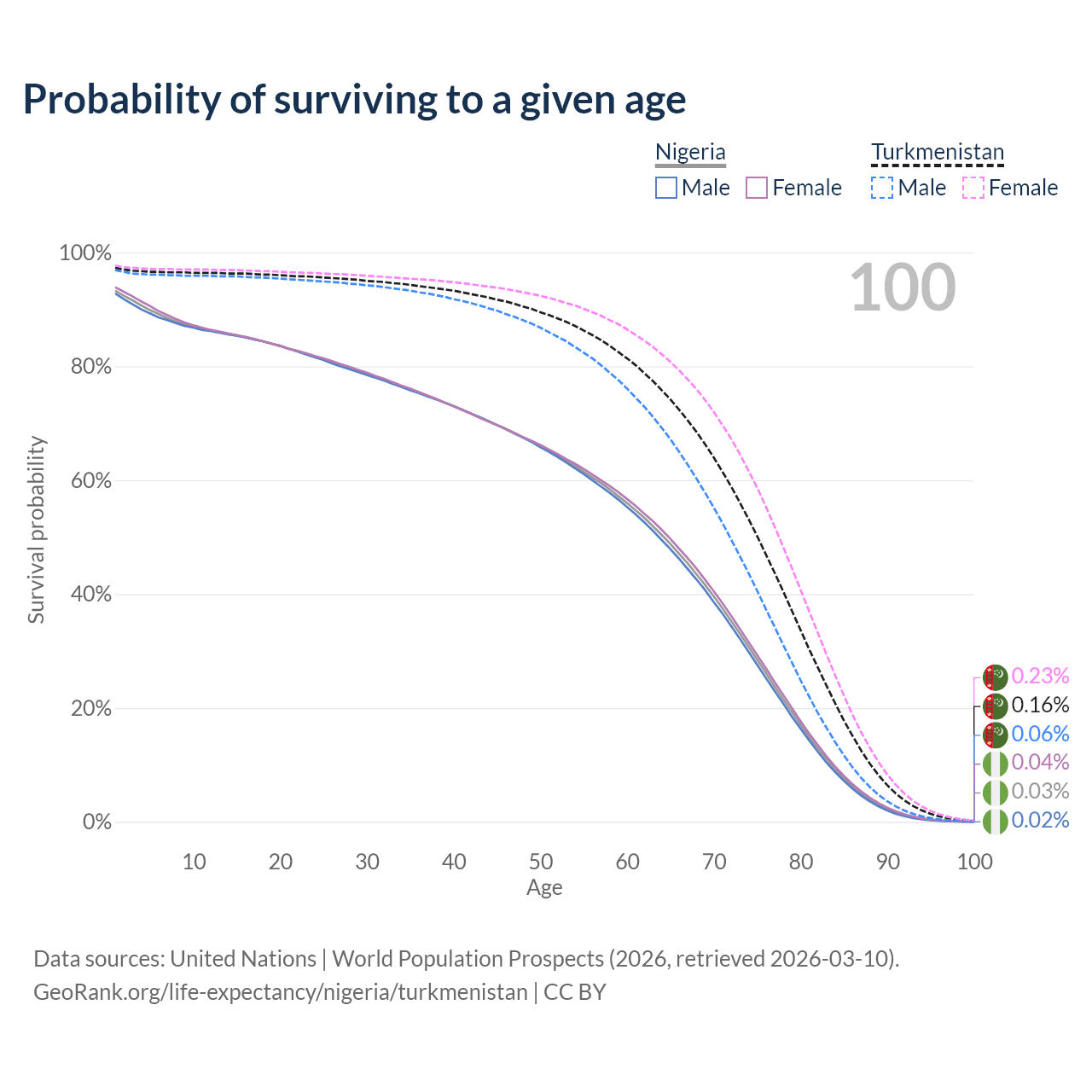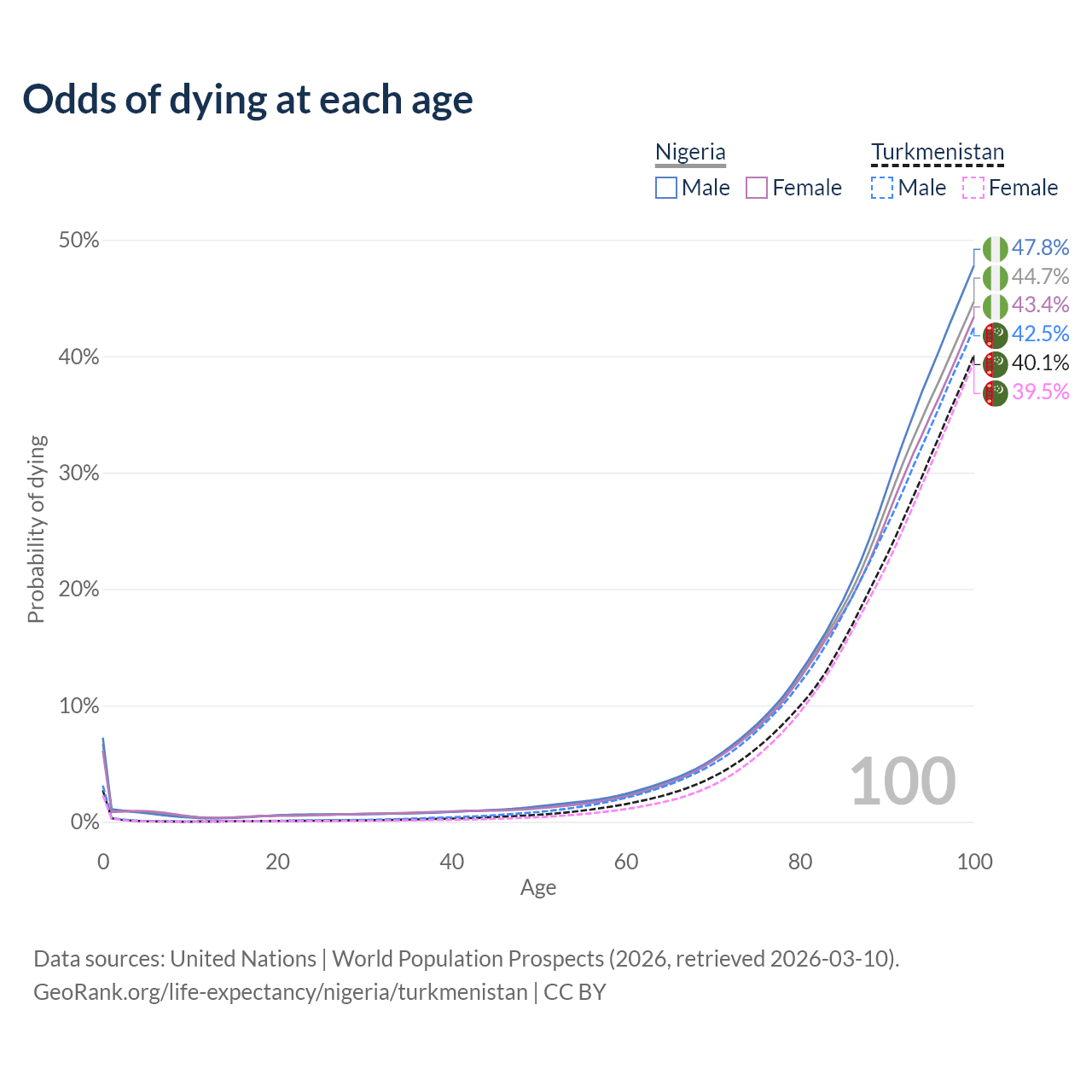 This life expectancy calculator shows the odds of living to 100, 95, 90, and below based on current age for both males and females in Nigeria and Turkmenistan, along with mean and median age of death. The calculations are based on the 2026 life tables (actuarial tables) from the UN World Population Prospects.