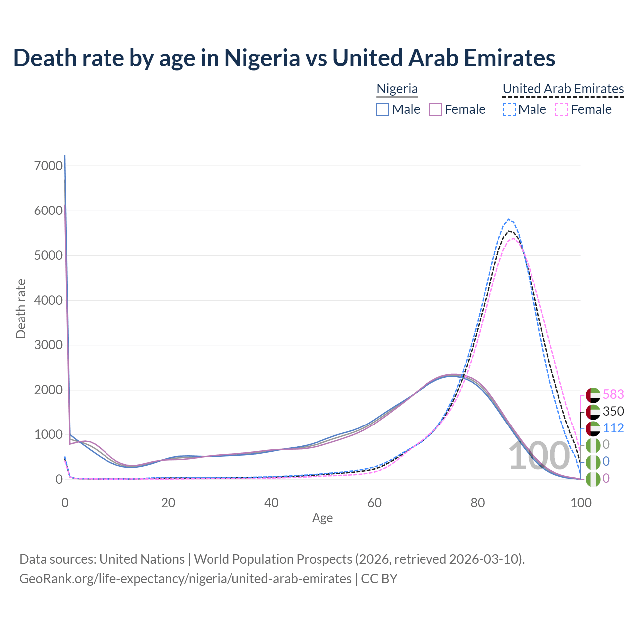 In Nigeria, the most common age of death is 0, compared to 86 in the United Arab Emirates. The median age of death is 64.3 in Nigeria and 85.6 in the United Arab Emirates, meaning only half of each cohort is expected to live past that age.