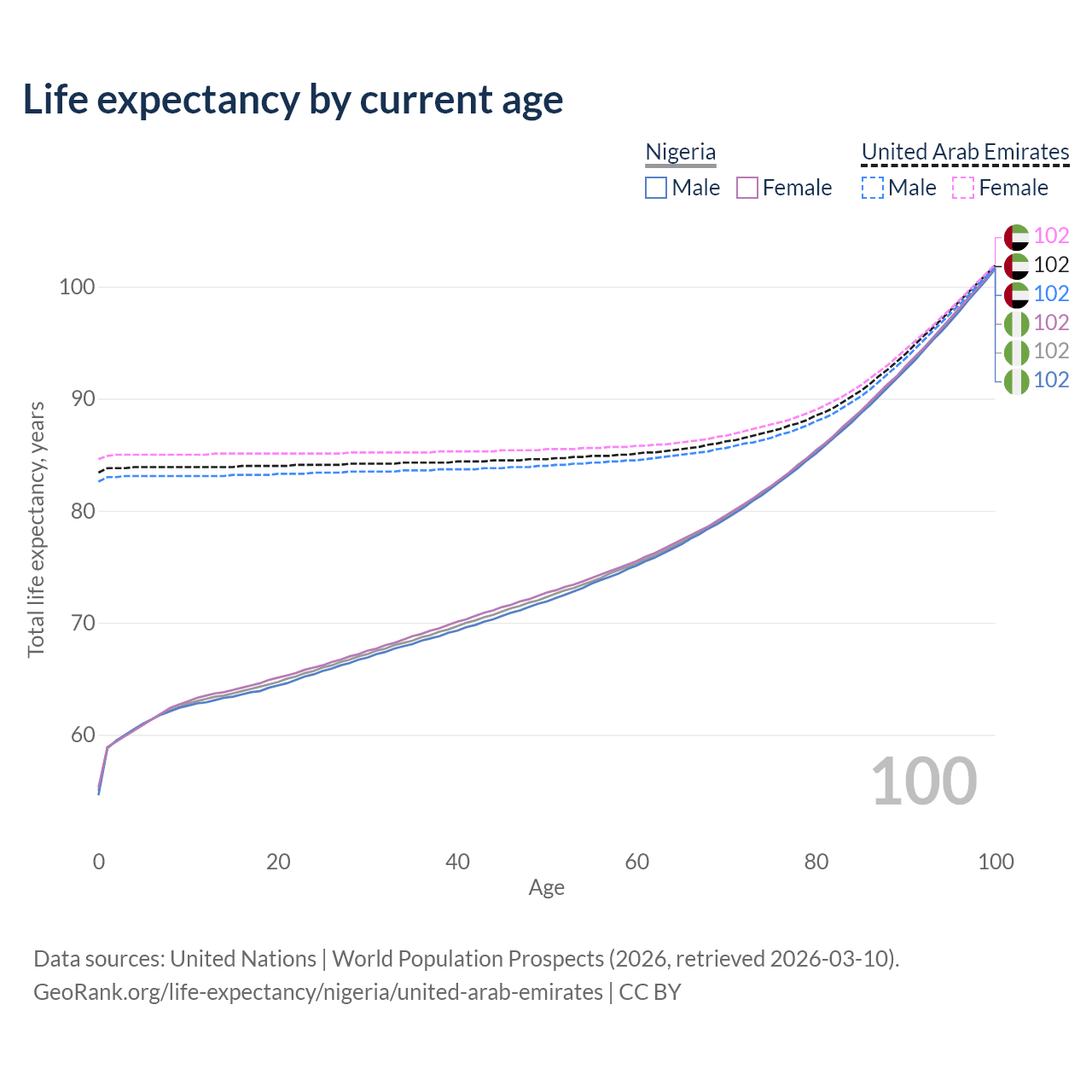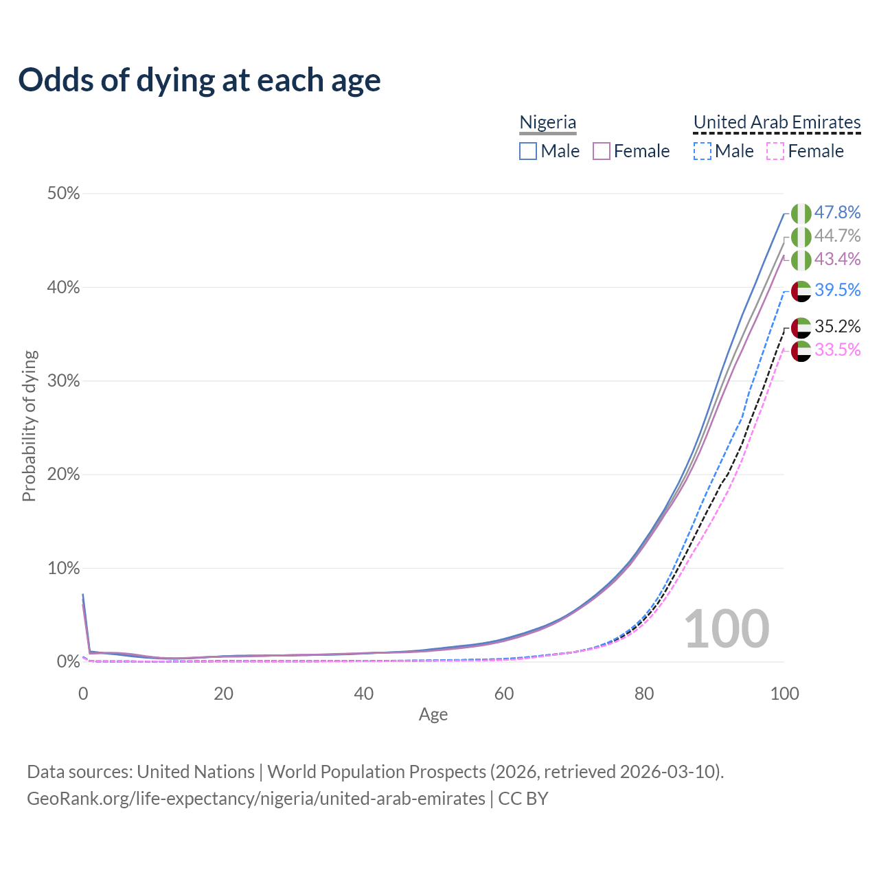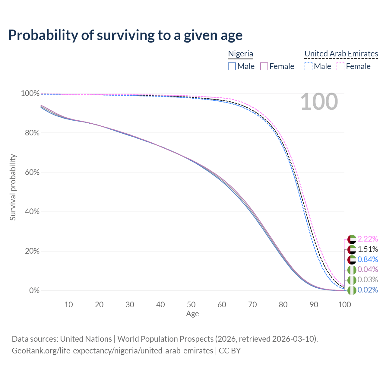 This life expectancy calculator shows the odds of living to 100, 95, 90, and below based on current age for both males and females in Nigeria and the United Arab Emirates, along with mean and median age of death. The calculations are based on the 2026 life tables (actuarial tables) from the UN World Population Prospects.