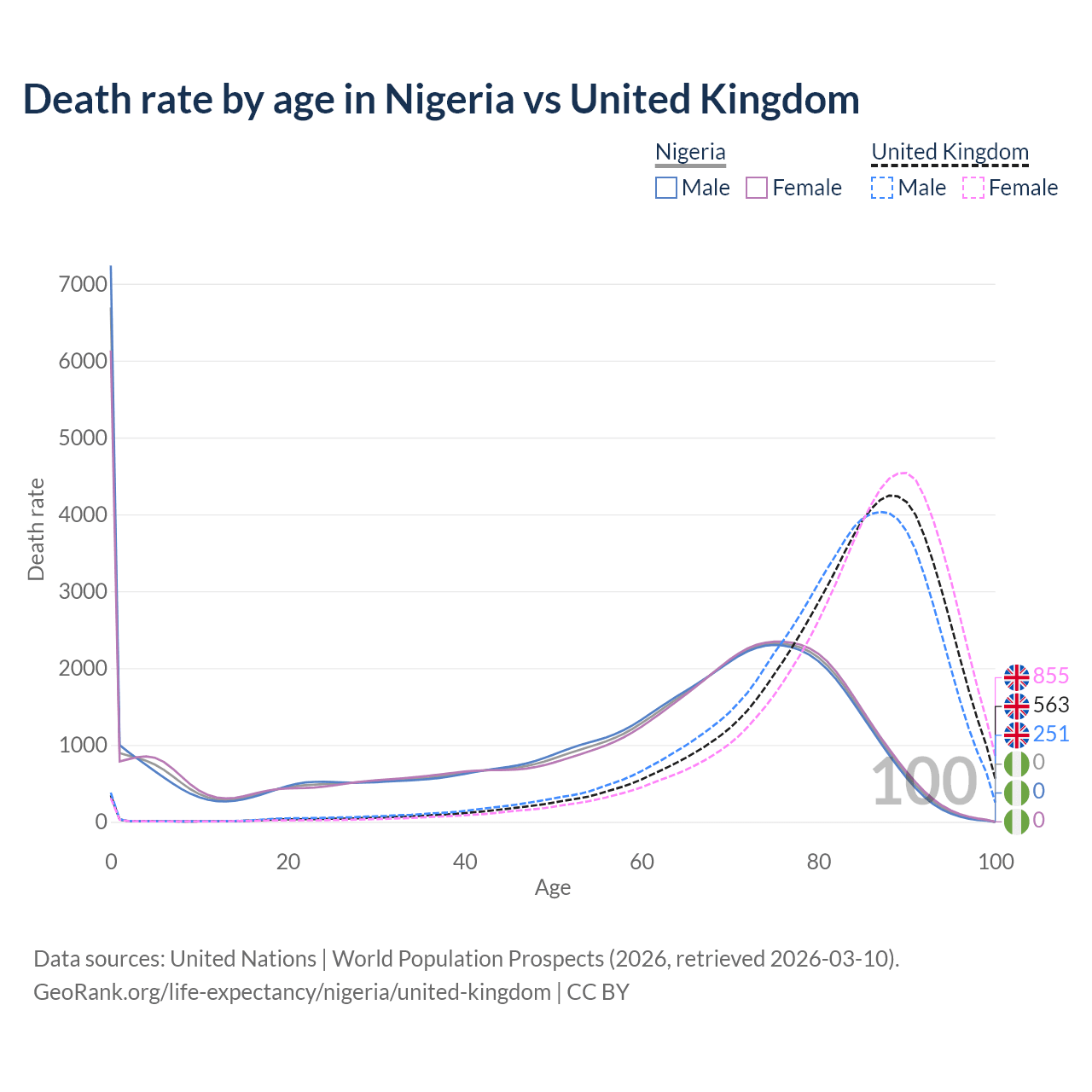 In Nigeria, the most common age of death is 0, compared to 88 in the United Kingdom. The median age of death is 64.3 in Nigeria and 84.9 in the United Kingdom, meaning only half of each cohort is expected to live past that age.
