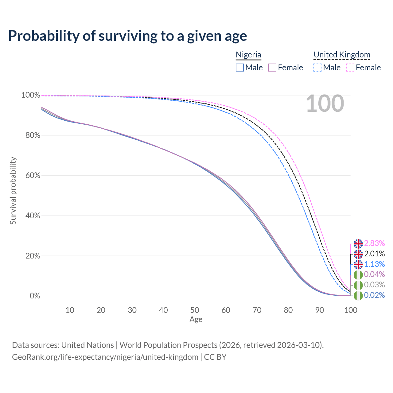 This life expectancy calculator shows the odds of living to 100, 95, 90, and below based on current age for both males and females in Nigeria and the United Kingdom, along with mean and median age of death. The calculations are based on the 2026 life tables (actuarial tables) from the UN World Population Prospects.