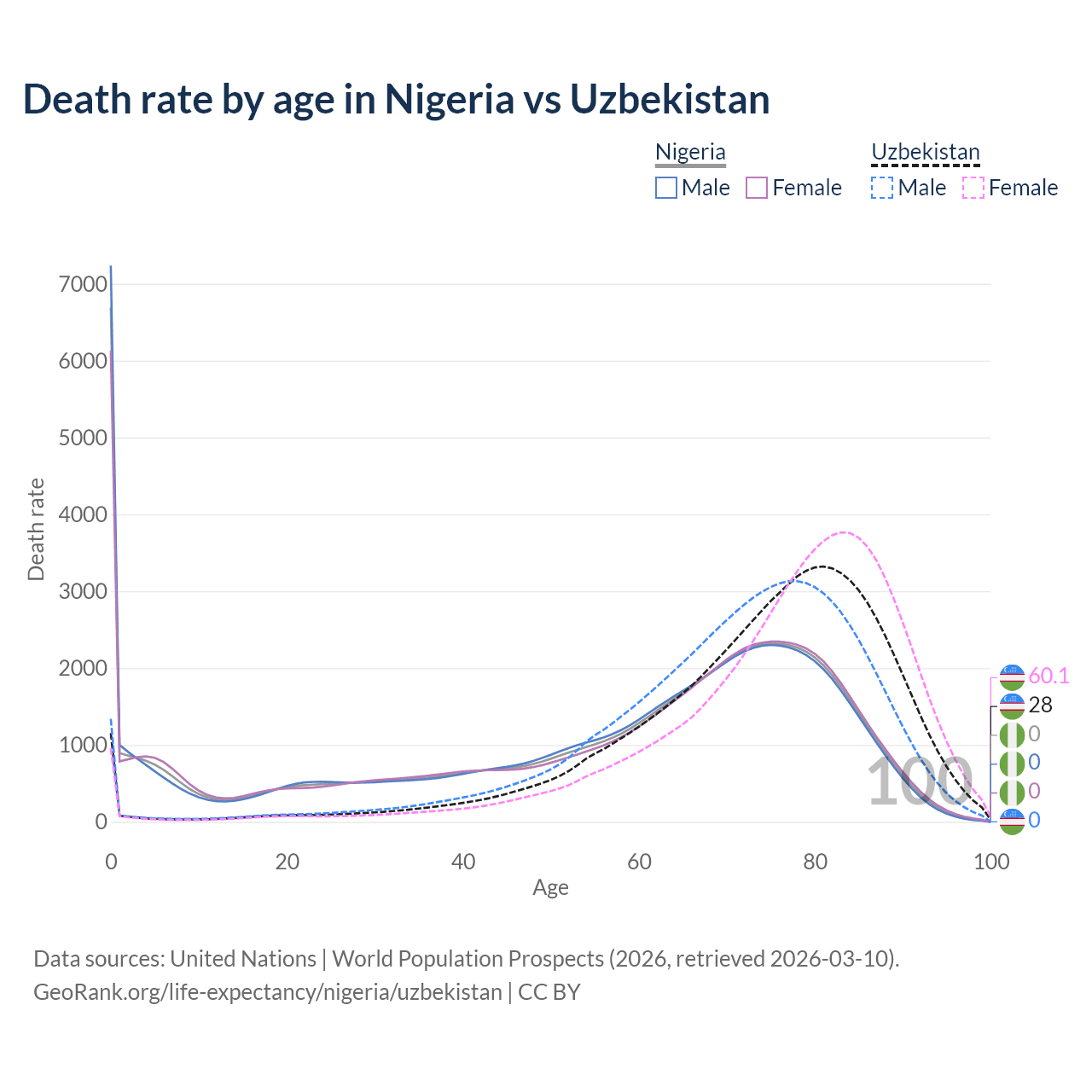 In Nigeria, the most common age of death is 0, compared to 81 in Uzbekistan. The median age of death is 64.3 in Nigeria and 76.4 in Uzbekistan, meaning only half of each cohort is expected to live past that age.