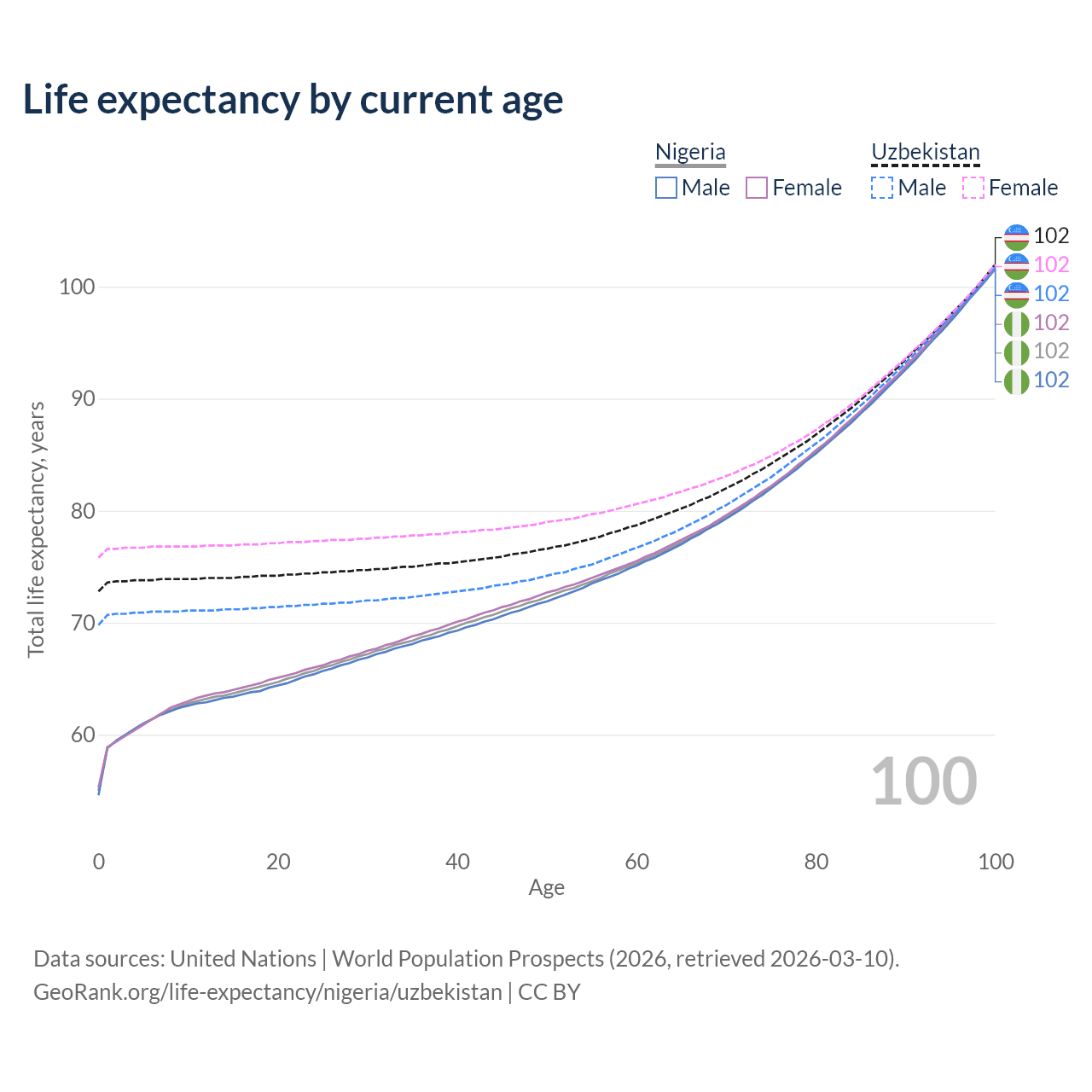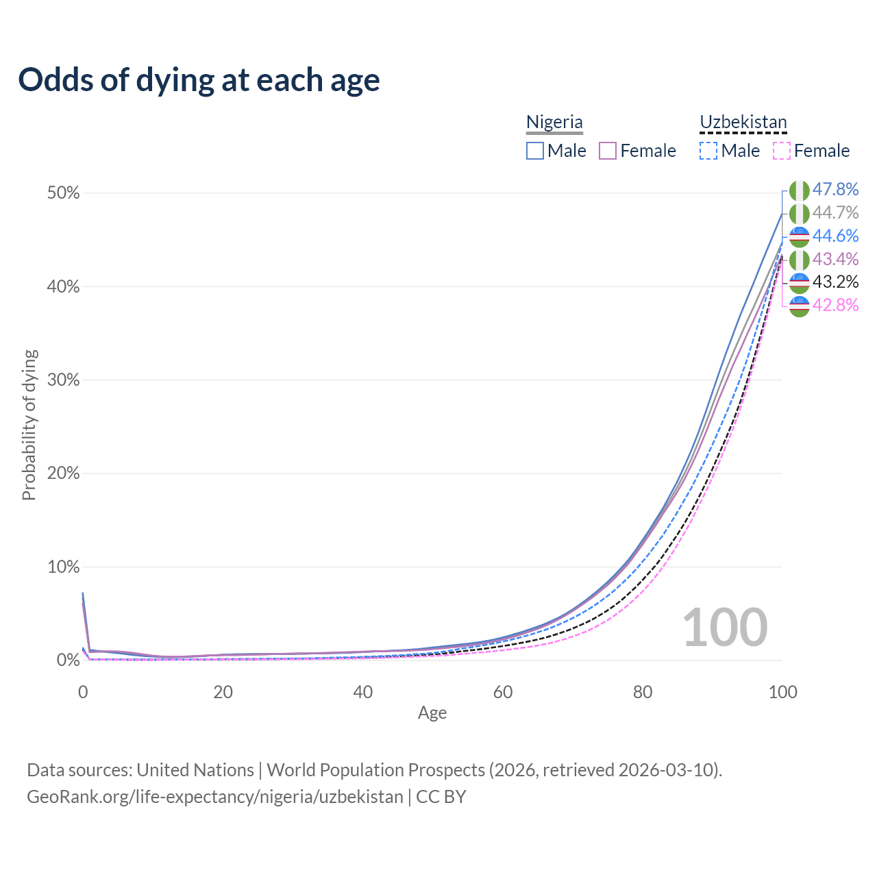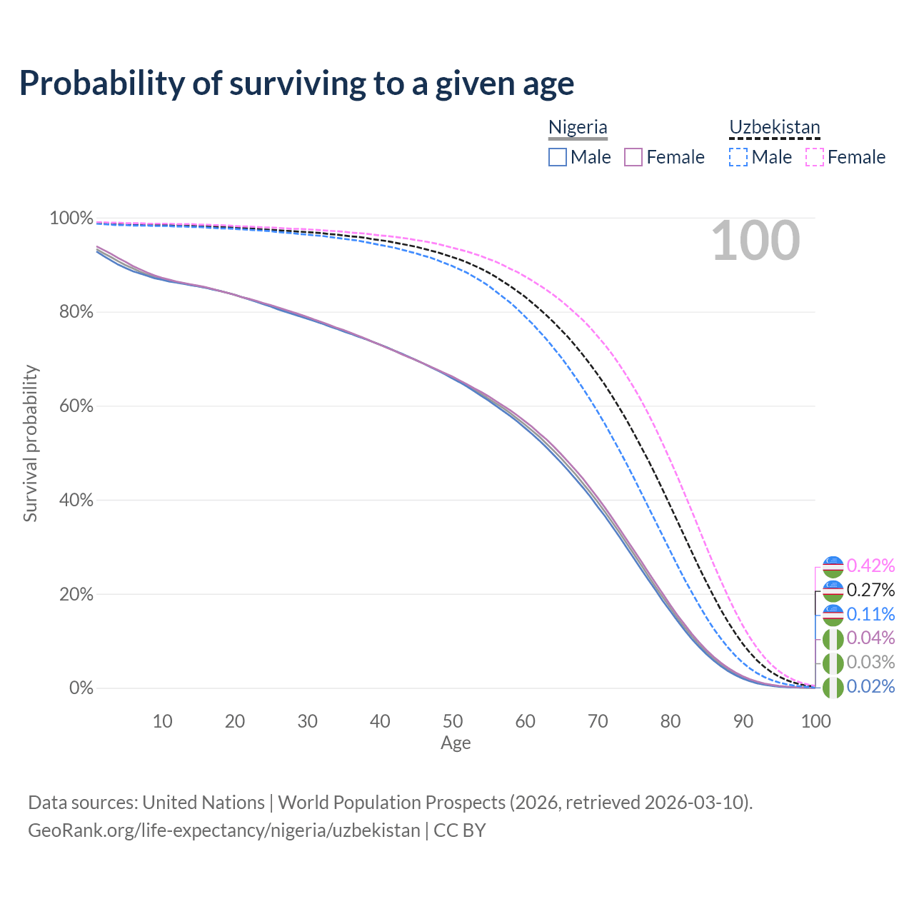 This life expectancy calculator shows the odds of living to 100, 95, 90, and below based on current age for both males and females in Nigeria and Uzbekistan, along with mean and median age of death. The calculations are based on the 2026 life tables (actuarial tables) from the UN World Population Prospects.