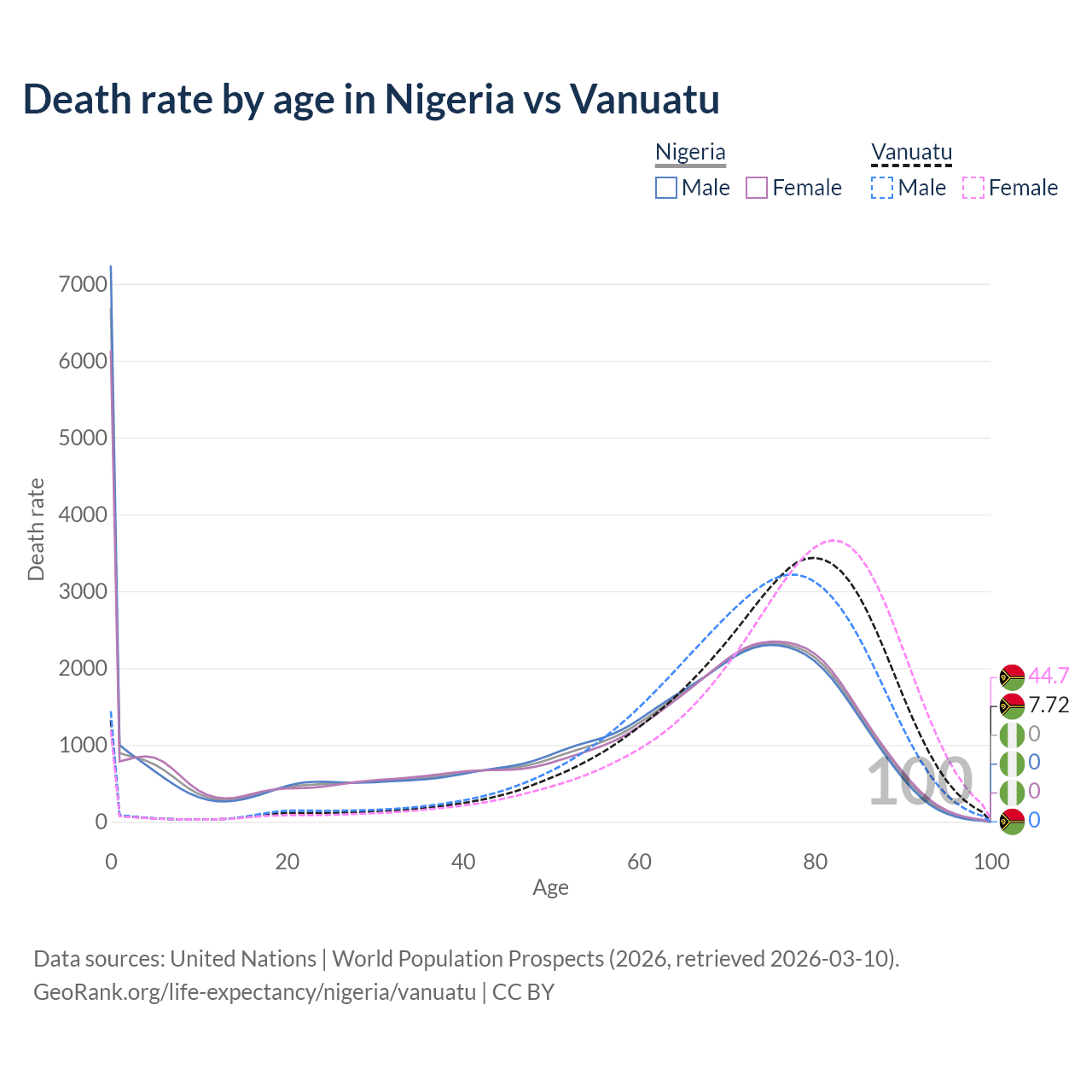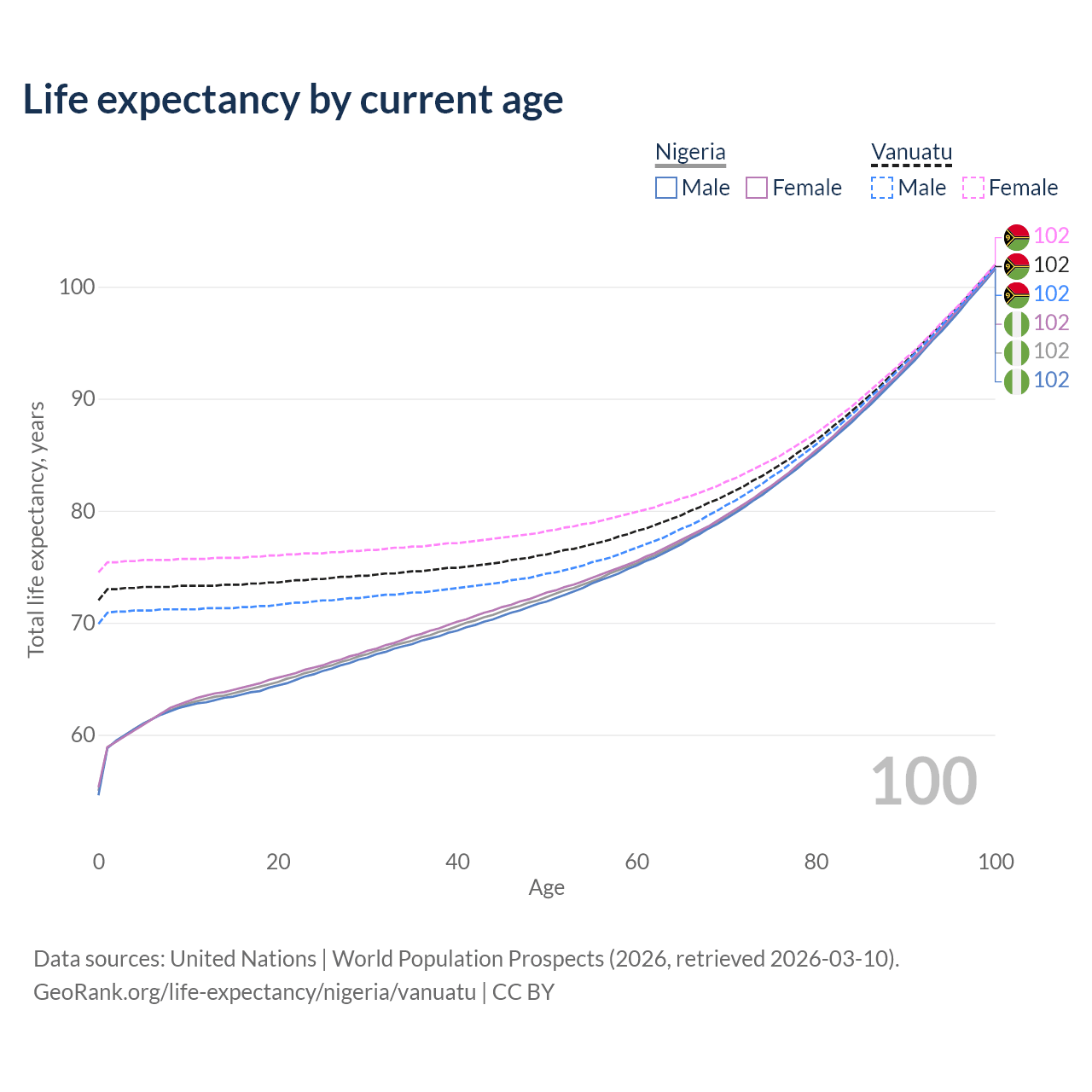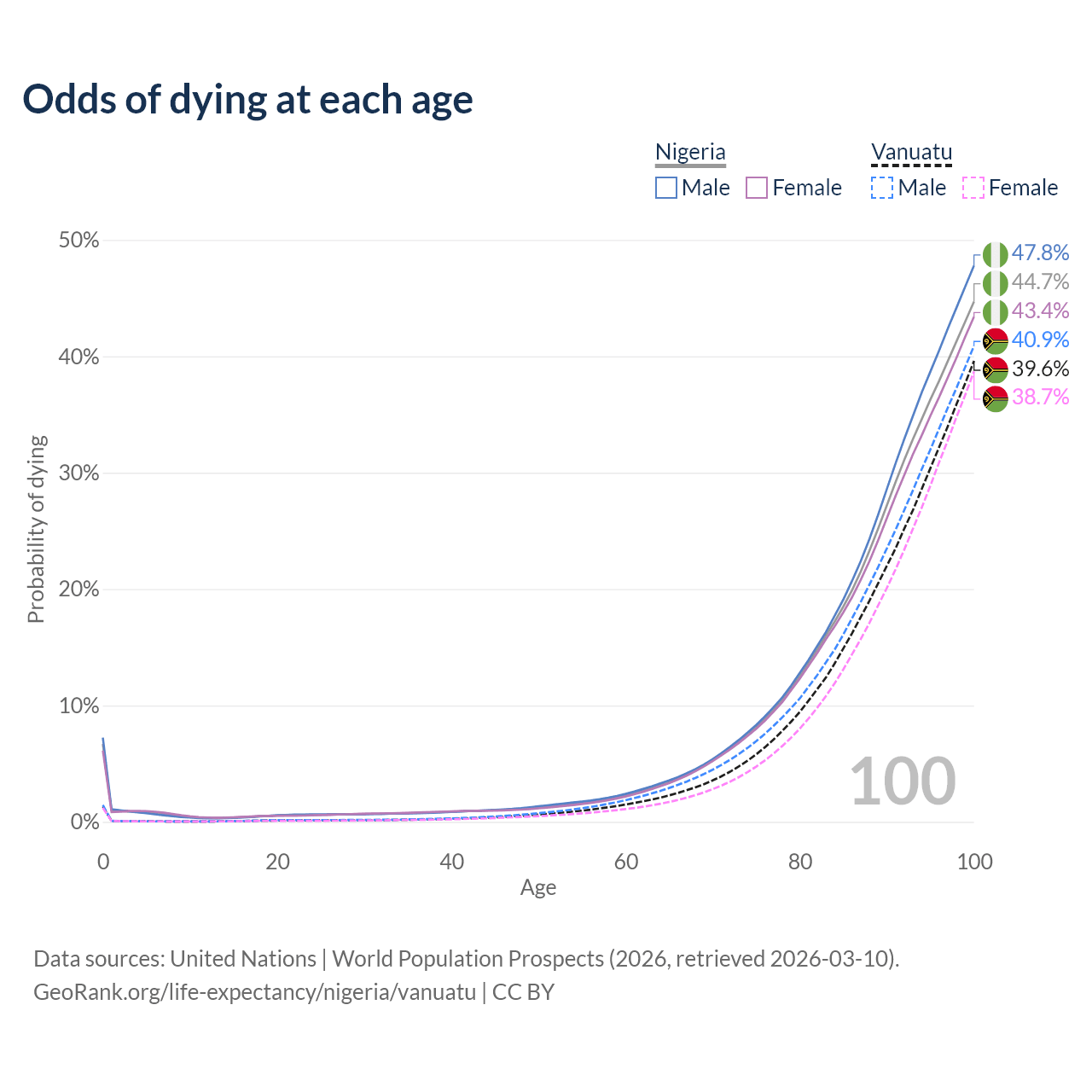 This life expectancy calculator shows the odds of living to 100, 95, 90, and below based on current age for both males and females in Nigeria and Vanuatu, along with mean and median age of death. The calculations are based on the 2026 life tables (actuarial tables) from the UN World Population Prospects.