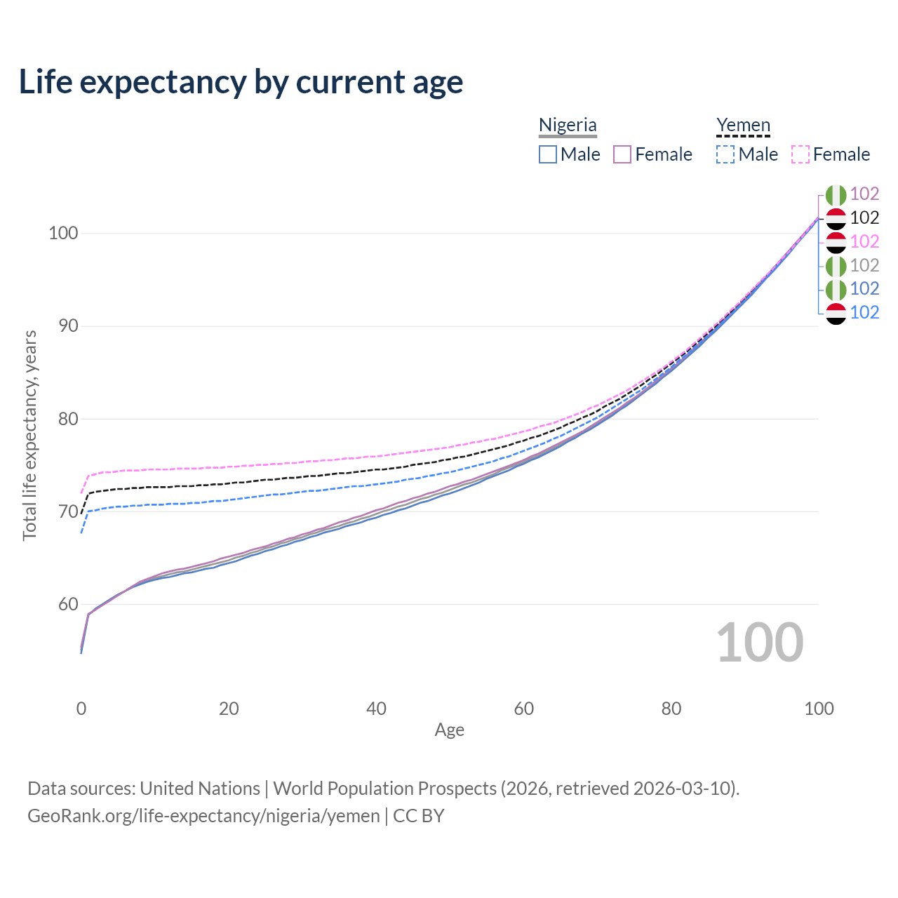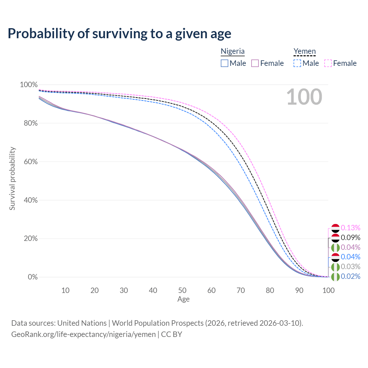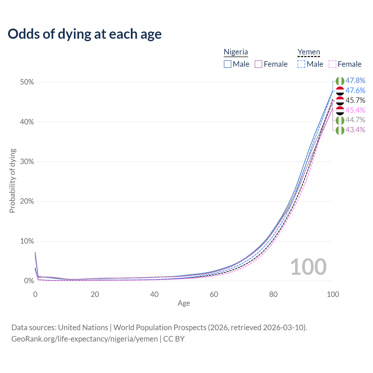 This life expectancy calculator shows the odds of living to 100, 95, 90, and below based on current age for both males and females in Nigeria and Yemen, along with mean and median age of death. The calculations are based on the 2026 life tables (actuarial tables) from the UN World Population Prospects.