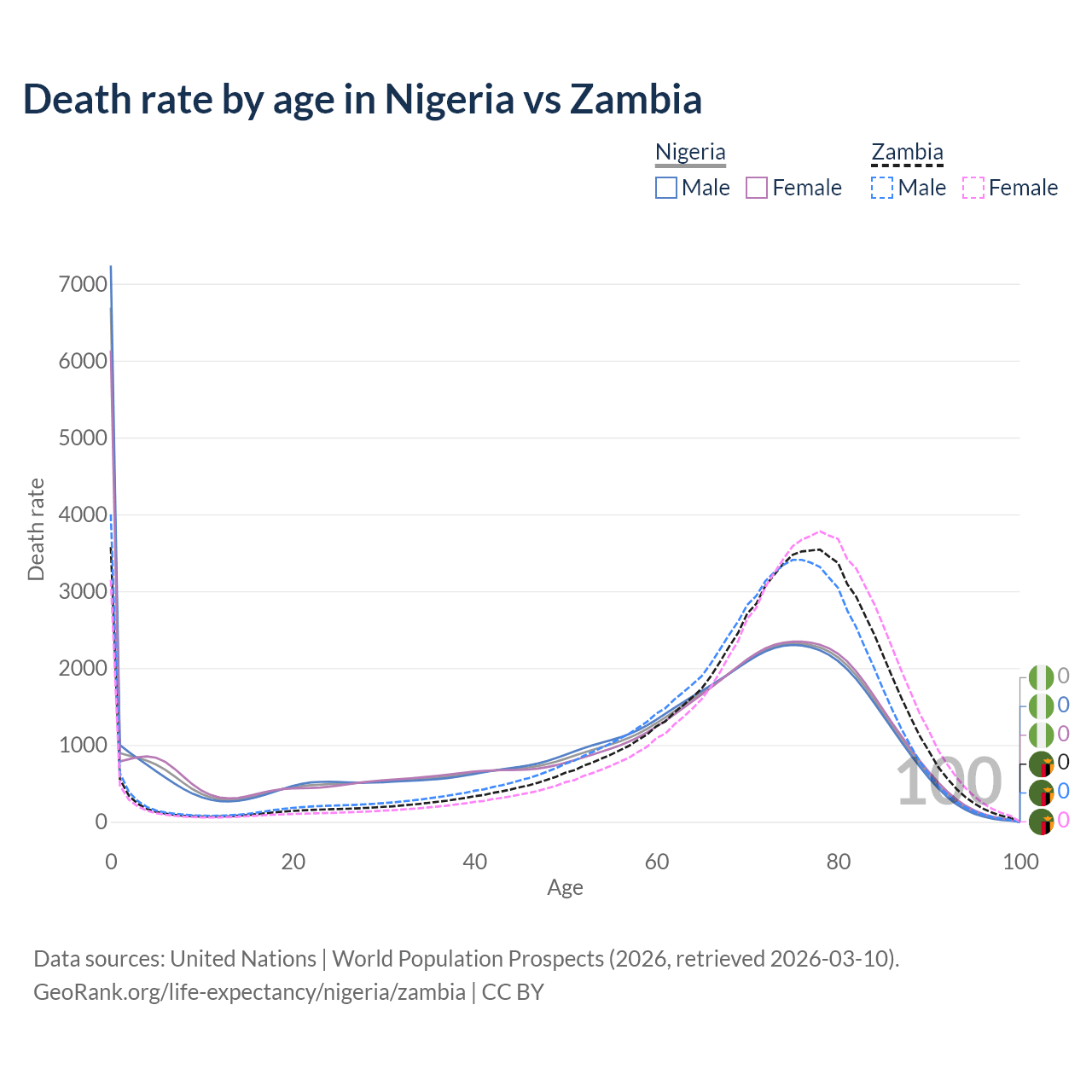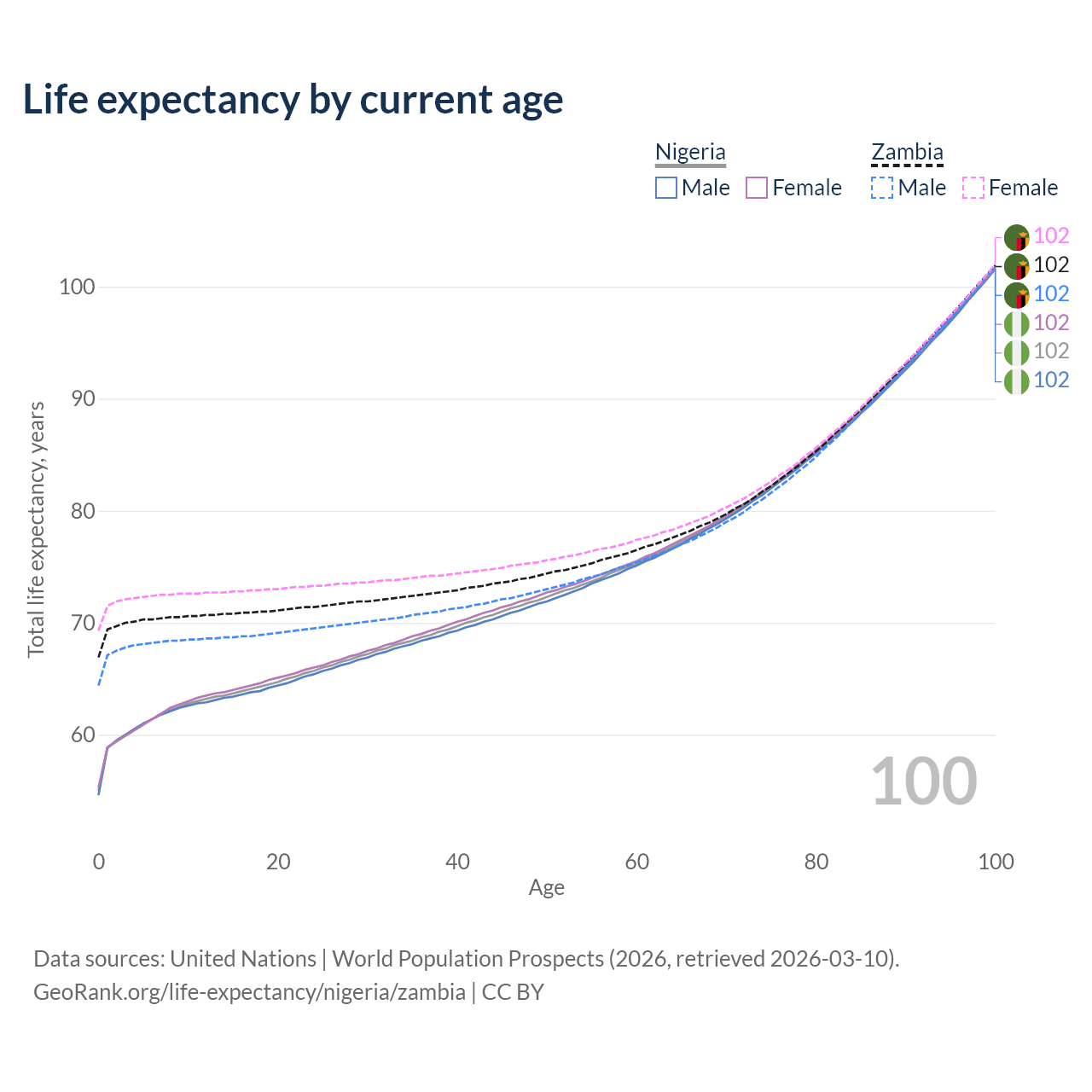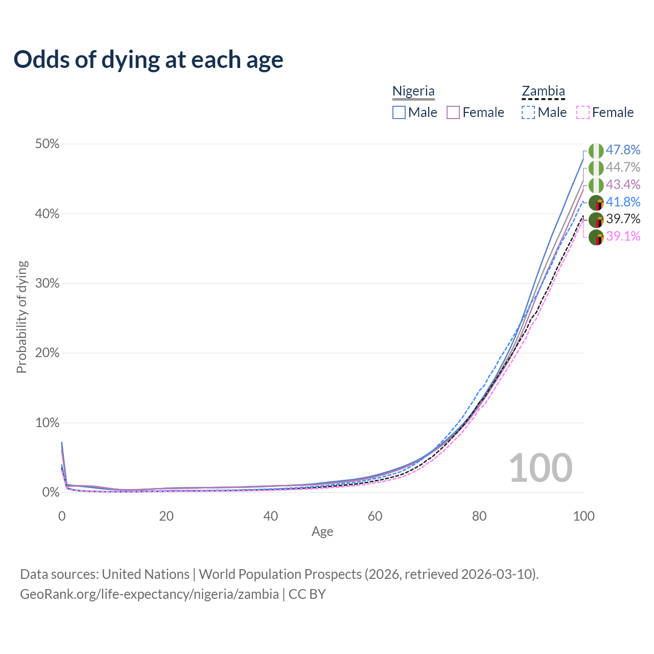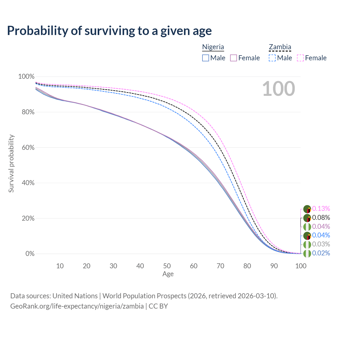 This life expectancy calculator shows the odds of living to 100, 95, 90, and below based on current age for both males and females in Nigeria and Zambia, along with mean and median age of death. The calculations are based on the 2026 life tables (actuarial tables) from the UN World Population Prospects.