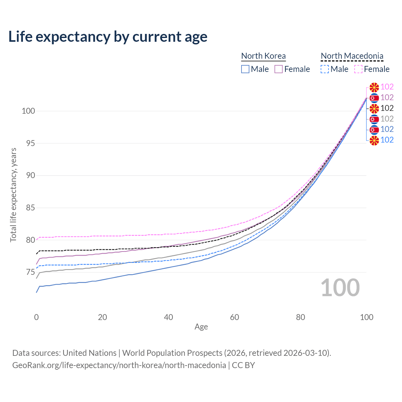 This life expectancy calculator shows the odds of living to 100, 95, 90, and below based on current age for both males and females in North Korea and North Macedonia, along with mean and median age of death. The calculations are based on the 2026 life tables (actuarial tables) from the UN World Population Prospects.