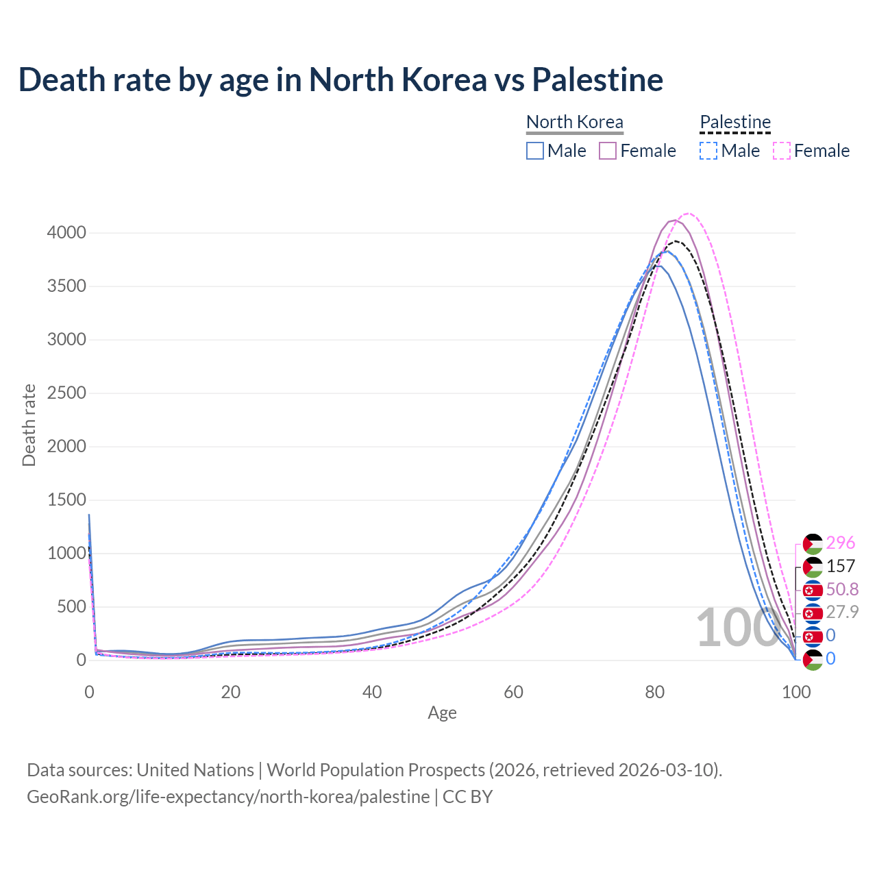 This life expectancy calculator shows the odds of living to 100, 95, 90, and below based on current age for both males and females in North Korea and Palestine, along with mean and median age of death. The calculations are based on the 2026 life tables (actuarial tables) from the UN World Population Prospects.
