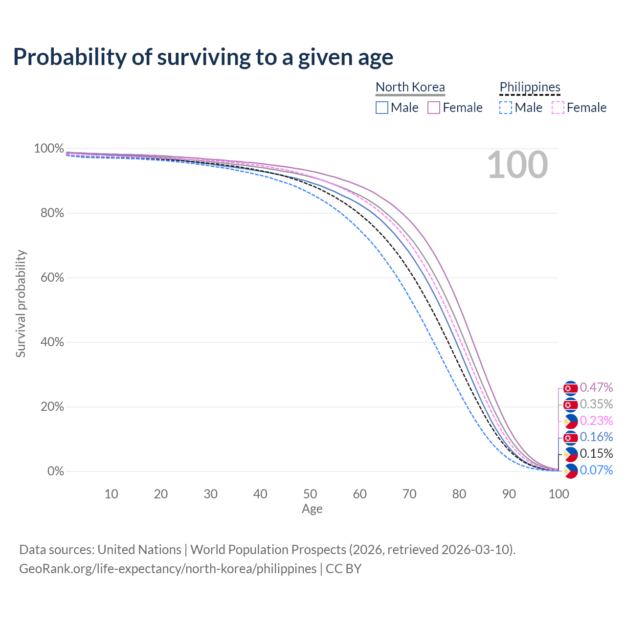 This life expectancy calculator shows the odds of living to 100, 95, 90, and below based on current age for both males and females in North Korea and the Philippines, along with mean and median age of death. The calculations are based on the 2026 life tables (actuarial tables) from the UN World Population Prospects.