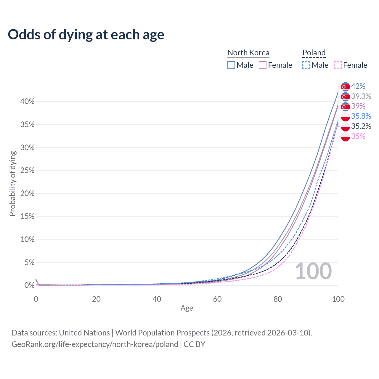 This life expectancy calculator shows the odds of living to 100, 95, 90, and below based on current age for both males and females in North Korea and Poland, along with mean and median age of death. The calculations are based on the 2026 life tables (actuarial tables) from the UN World Population Prospects.