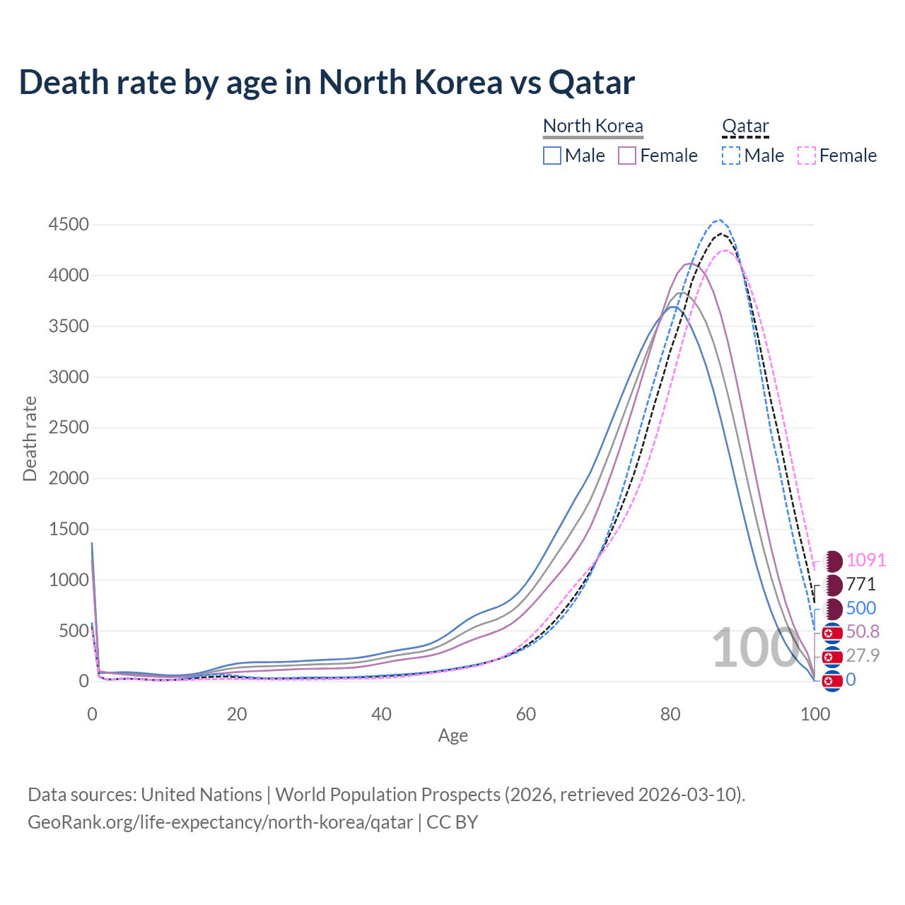 This life expectancy calculator shows the odds of living to 100, 95, 90, and below based on current age for both males and females in North Korea and Qatar, along with mean and median age of death. The calculations are based on the 2026 life tables (actuarial tables) from the UN World Population Prospects.