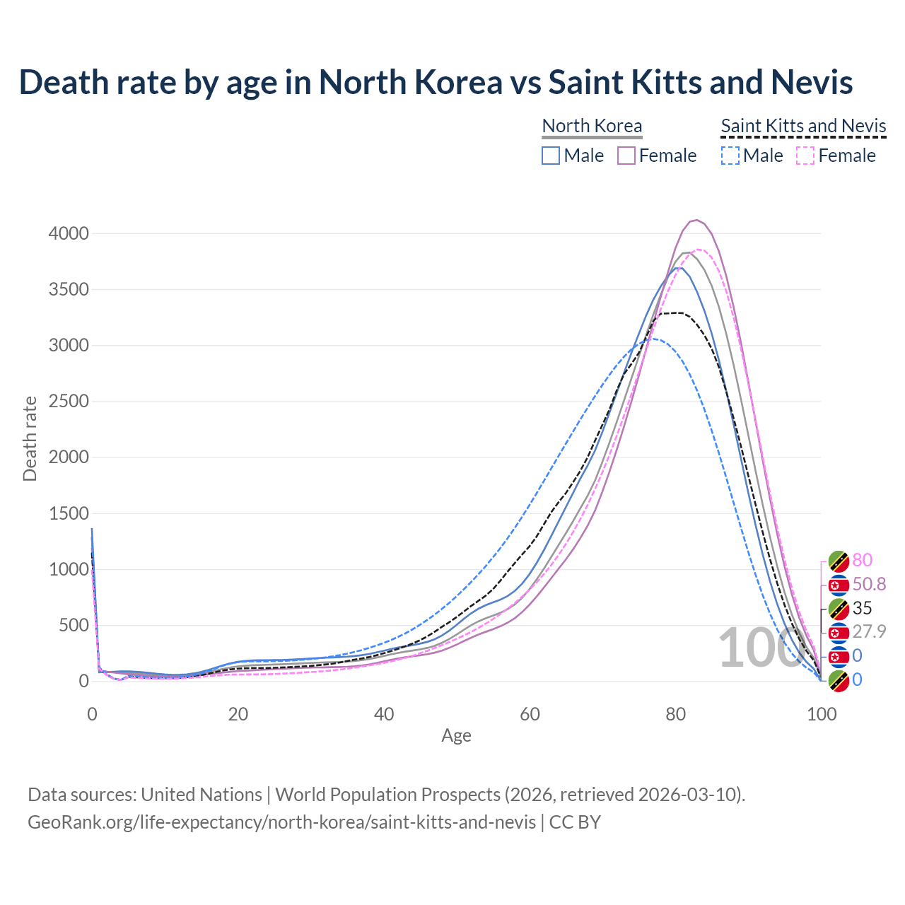 In North Korea, the most common age of death is 82, compared to 80 in Saint Kitts and Nevis. The median age of death is 78.5 in North Korea and 76.3 in Saint Kitts and Nevis, meaning only half of each cohort is expected to live past that age.