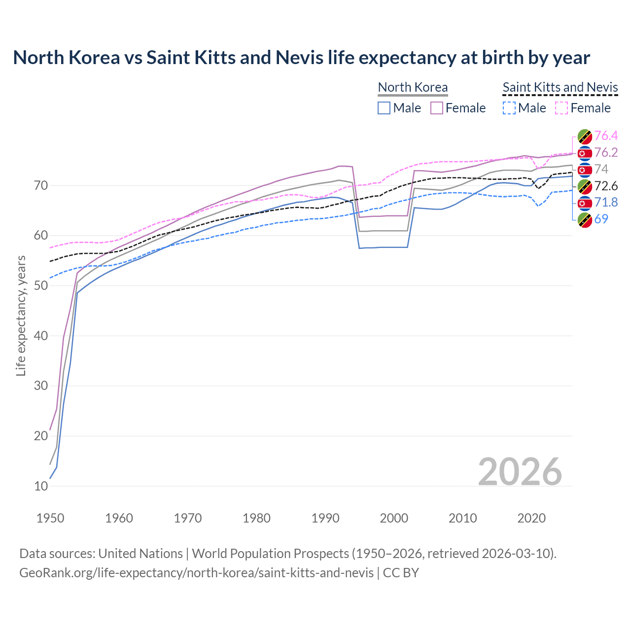 North Korea vs Saint Kitts and Nevis life expectancy at birth by year