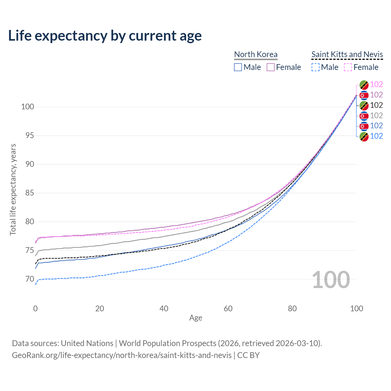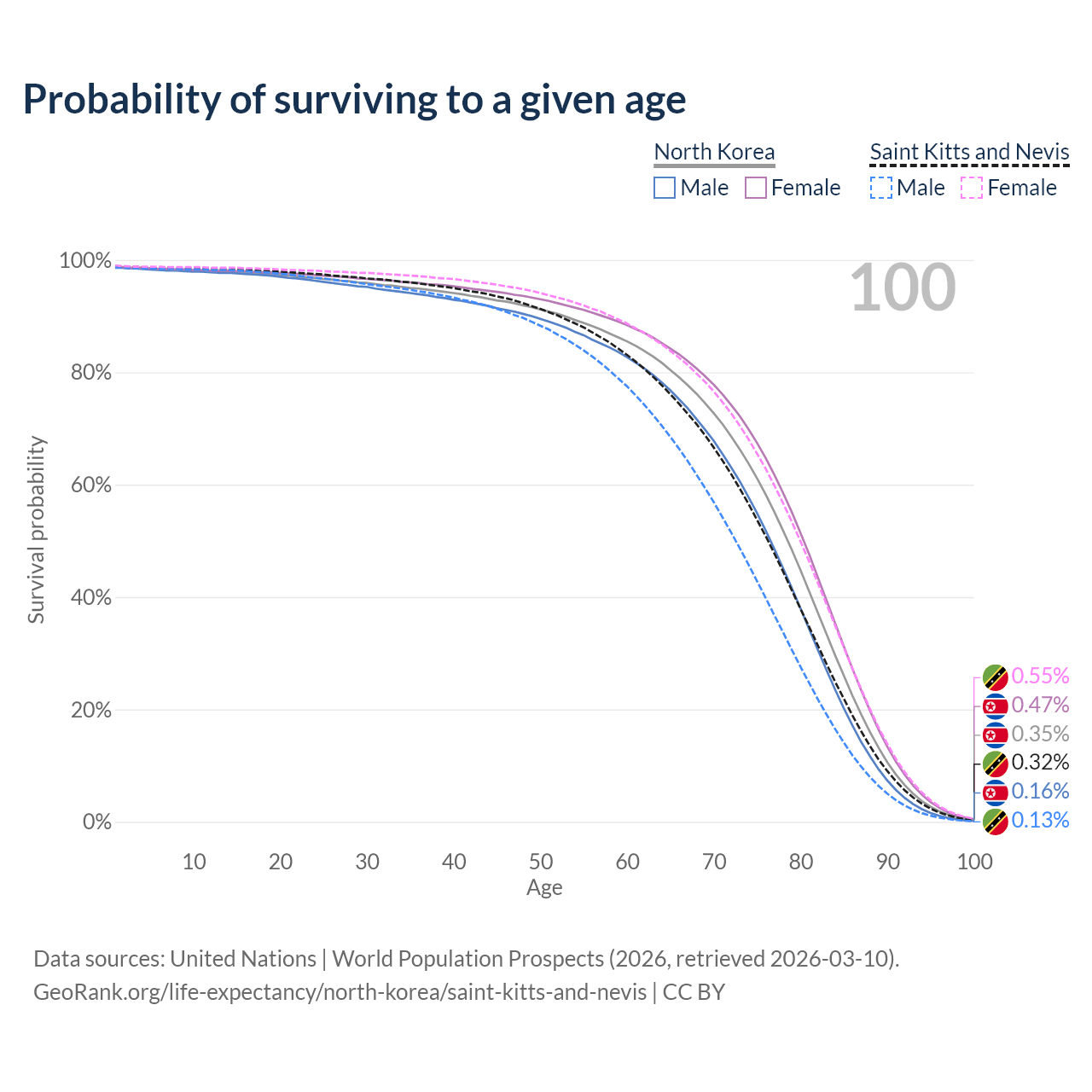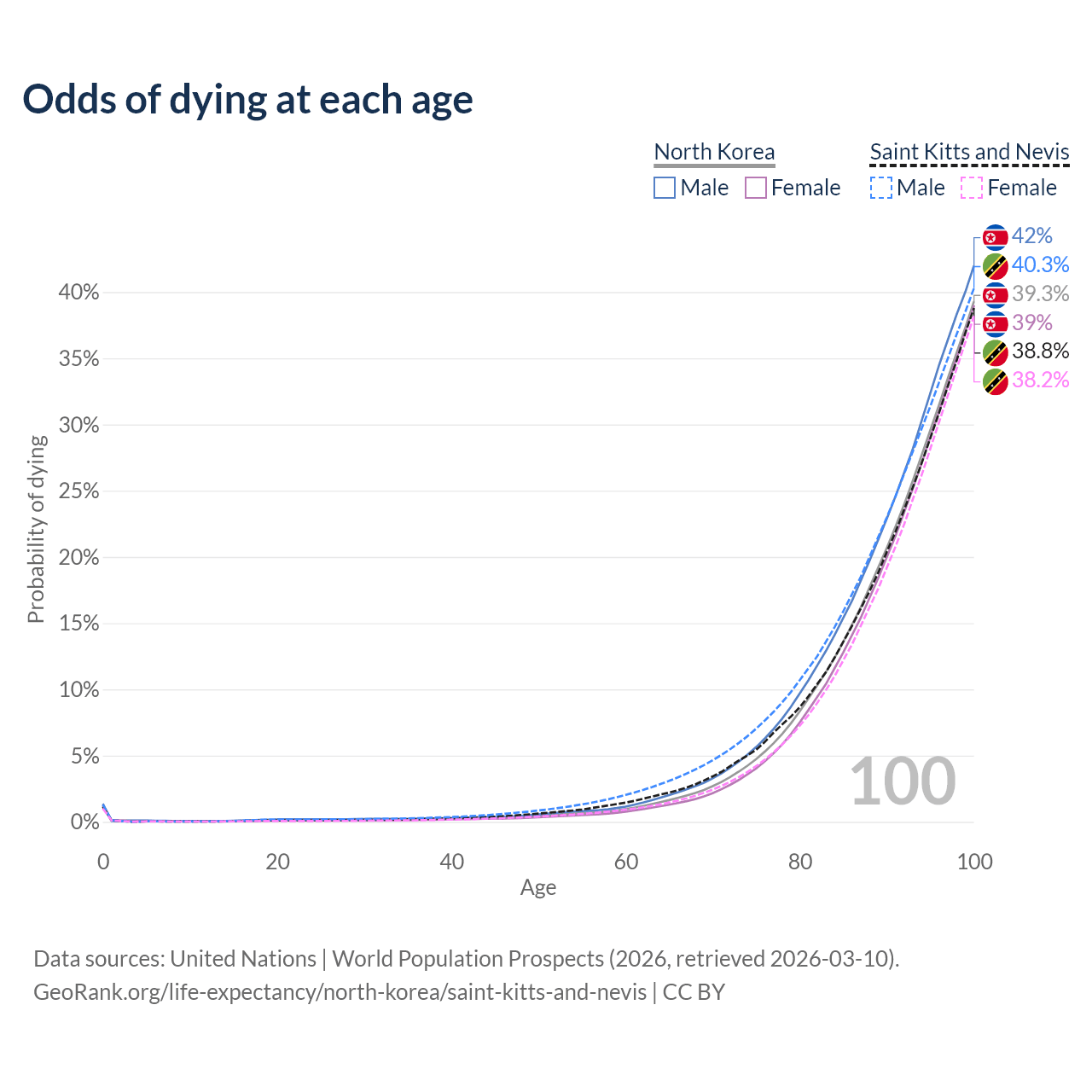 This life expectancy calculator shows the odds of living to 100, 95, 90, and below based on current age for both males and females in North Korea and Saint Kitts and Nevis, along with mean and median age of death. The calculations are based on the 2026 life tables (actuarial tables) from the UN World Population Prospects.