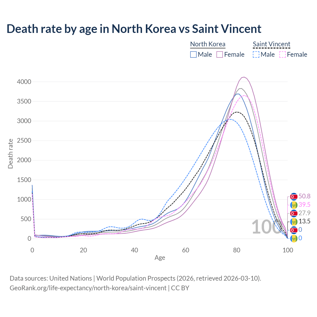 In North Korea, the most common age of death is 82, compared to 80 in Saint Vincent. The median age of death is 78.5 in North Korea and 75.6 in Saint Vincent, meaning only half of each cohort is expected to live past that age.