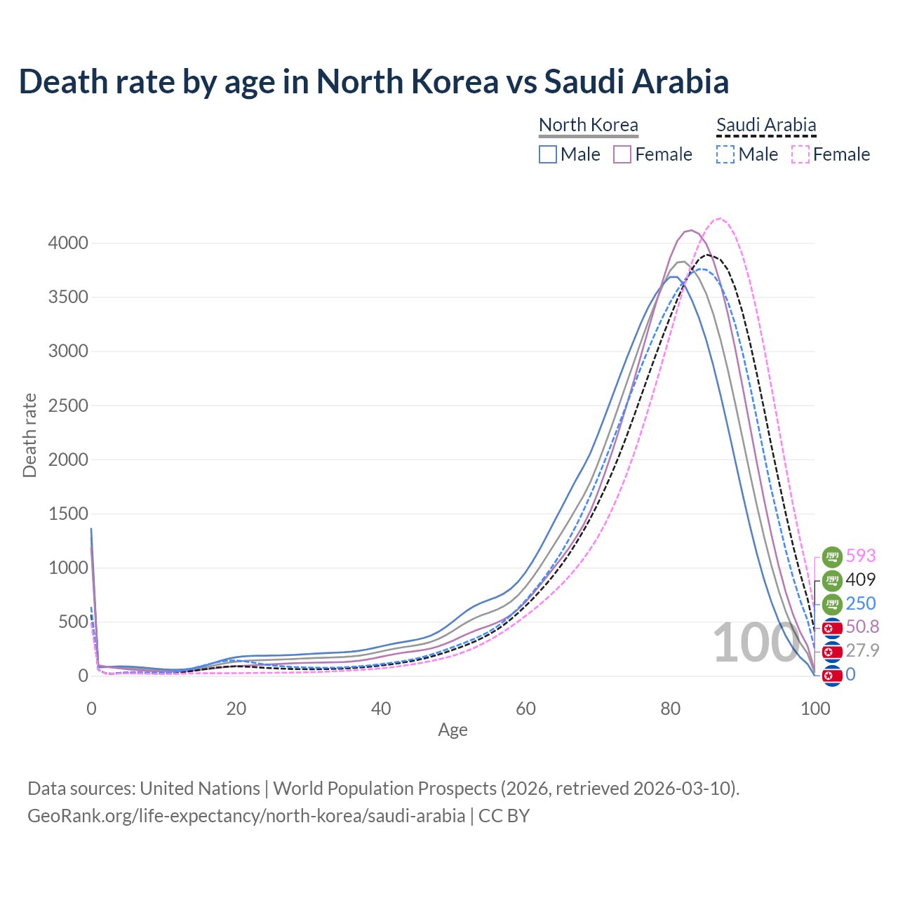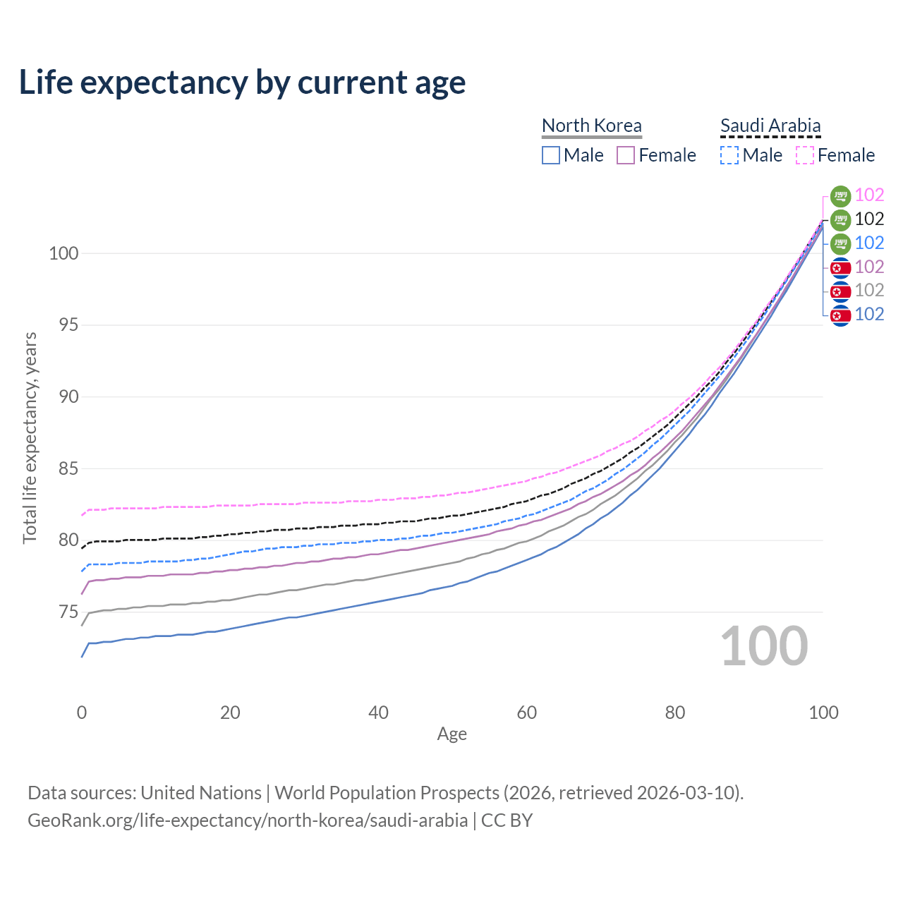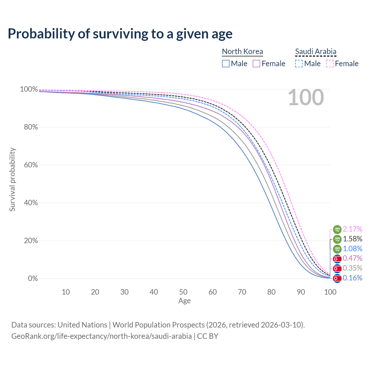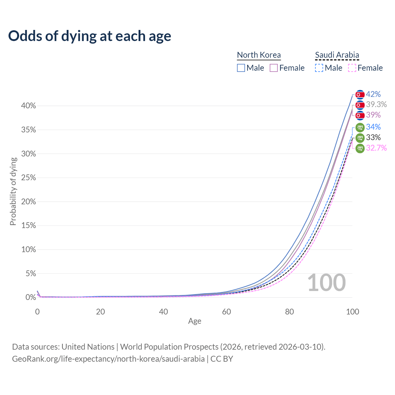 This life expectancy calculator shows the odds of living to 100, 95, 90, and below based on current age for both males and females in North Korea and Saudi Arabia, along with mean and median age of death. The calculations are based on the 2026 life tables (actuarial tables) from the UN World Population Prospects.