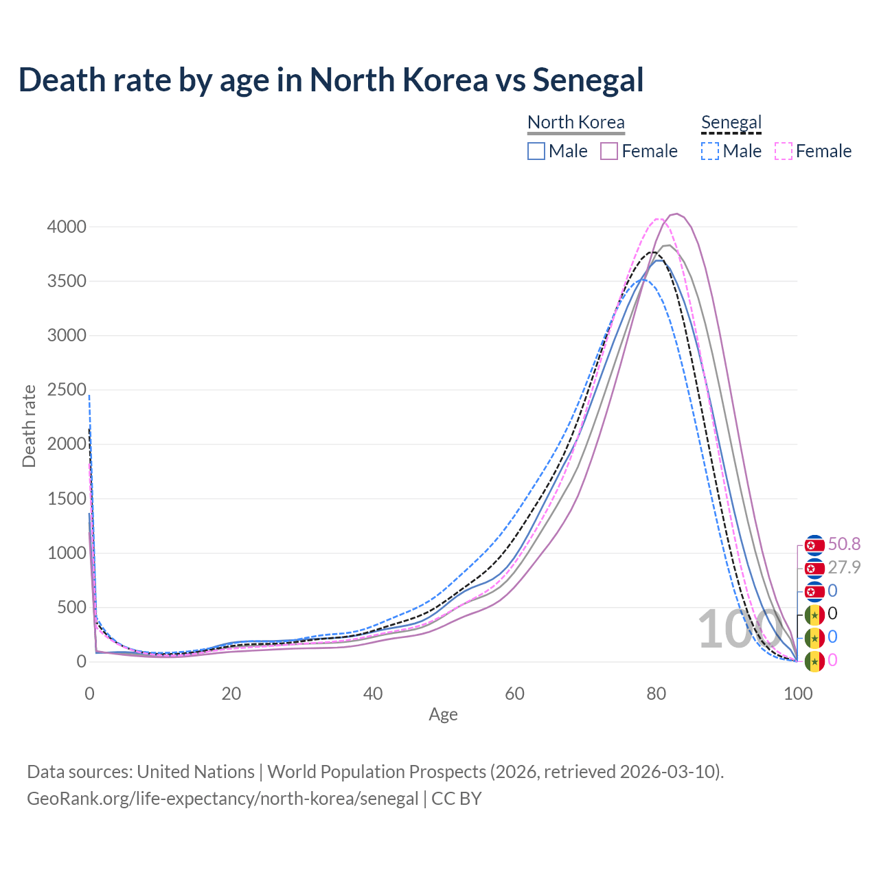 In North Korea, the most common age of death is 82, compared to 80 in Senegal. The median age of death is 78.5 in North Korea and 75 in Senegal, meaning only half of each cohort is expected to live past that age.