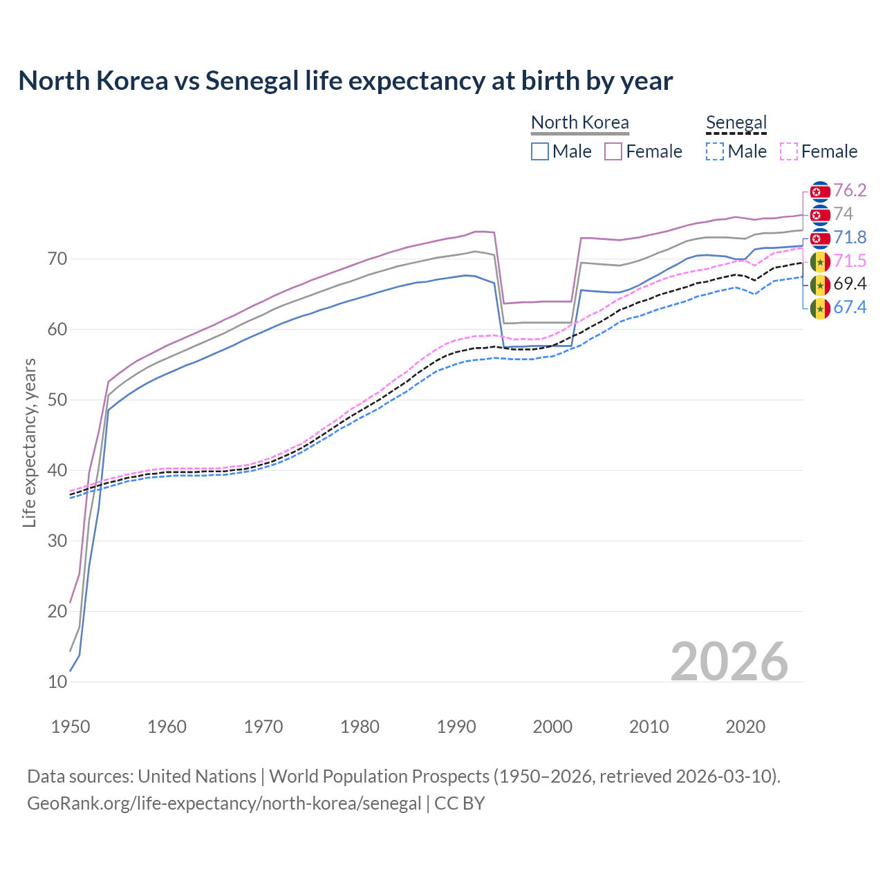 The average life expectancy at birth is 74 years in North Korea vs 69.4 in Senegal. North Korea is ranked 104/197 by life expectancy, and Senegal is 143/197. In North Korea, the life expectancy is 71.8 years for males and 76.2 years for females. In Senegal, it's 67.4 years for males and 71.5 years for females.