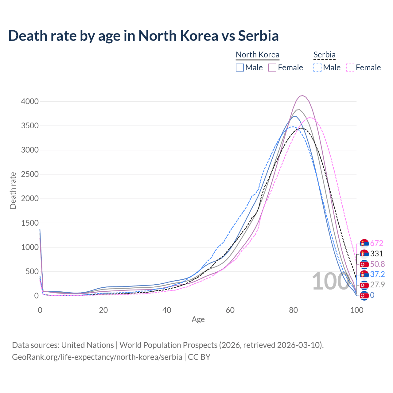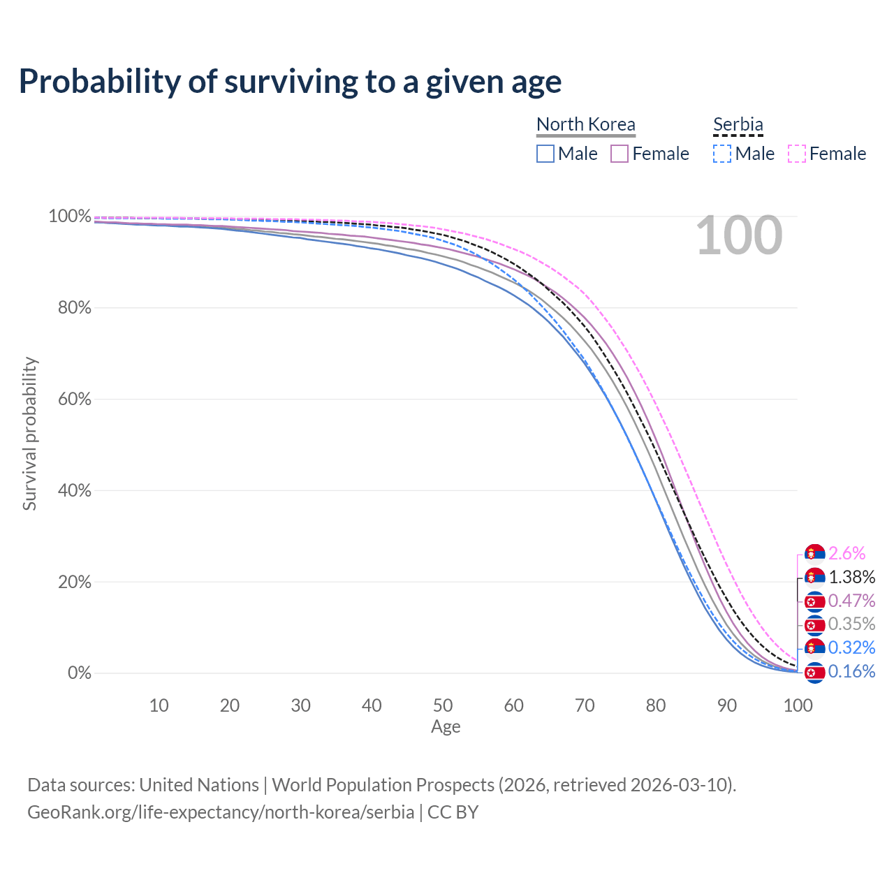 This life expectancy calculator shows the odds of living to 100, 95, 90, and below based on current age for both males and females in North Korea and Serbia, along with mean and median age of death. The calculations are based on the 2026 life tables (actuarial tables) from the UN World Population Prospects.