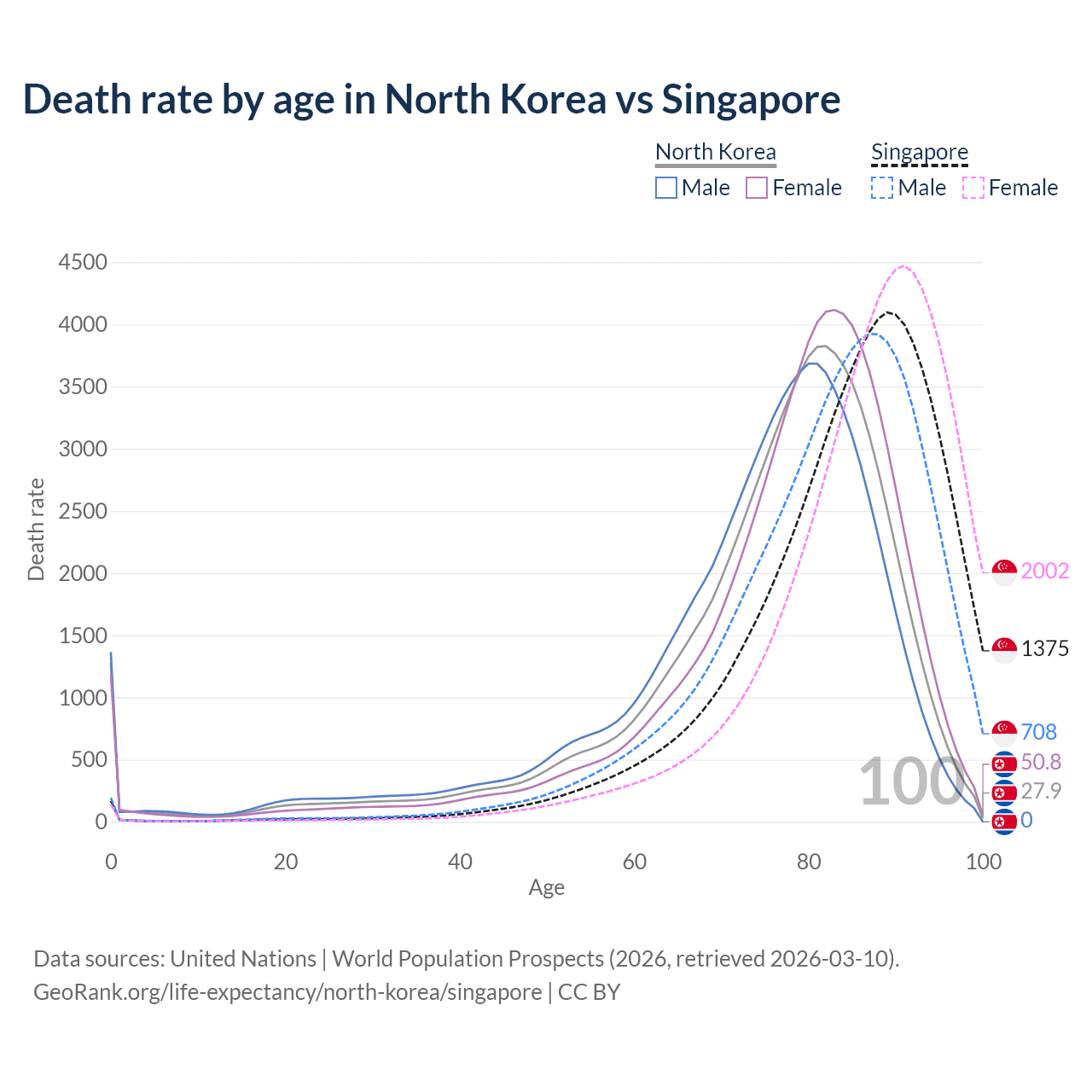 In North Korea, the most common age of death is 82, compared to 89 in Singapore. The median age of death is 78.5 in North Korea and 86.5 in Singapore, meaning only half of each cohort is expected to live past that age.