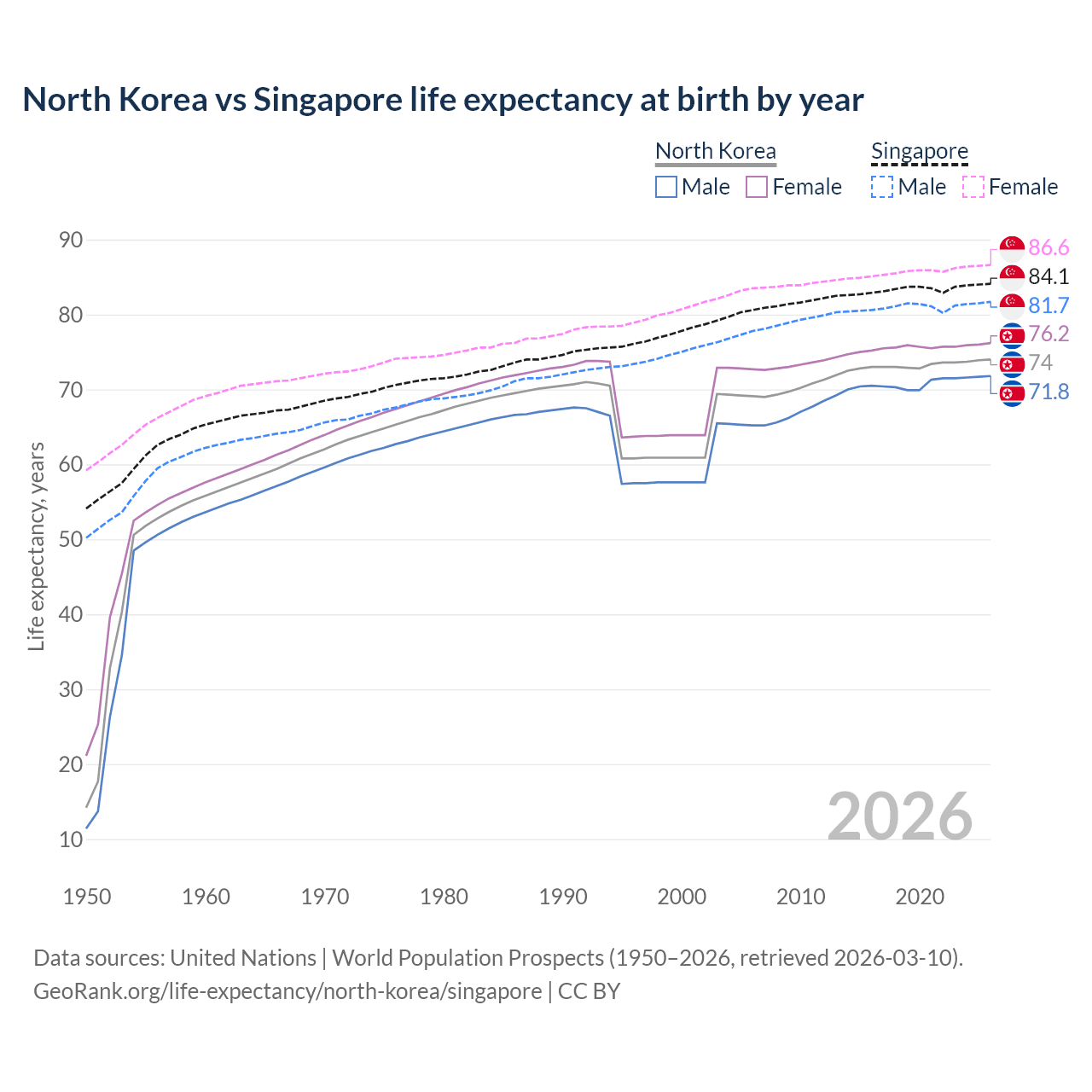 The average life expectancy at birth is 74 years in North Korea vs 84.1 in Singapore. North Korea is ranked 104/197 by life expectancy, and Singapore is 9/197. In North Korea, the life expectancy is 71.8 years for males and 76.2 years for females. In Singapore, it's 81.7 years for males and 86.6 years for females.
