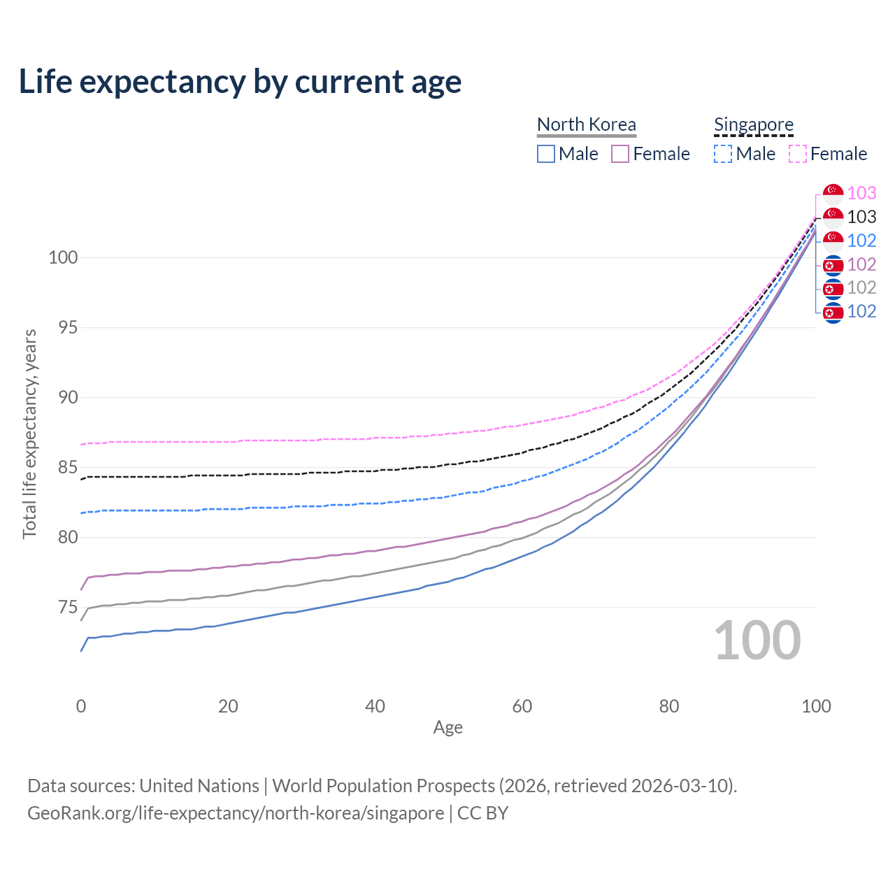 This life expectancy calculator shows the odds of living to 100, 95, 90, and below based on current age for both males and females in North Korea and Singapore, along with mean and median age of death. The calculations are based on the 2026 life tables (actuarial tables) from the UN World Population Prospects.