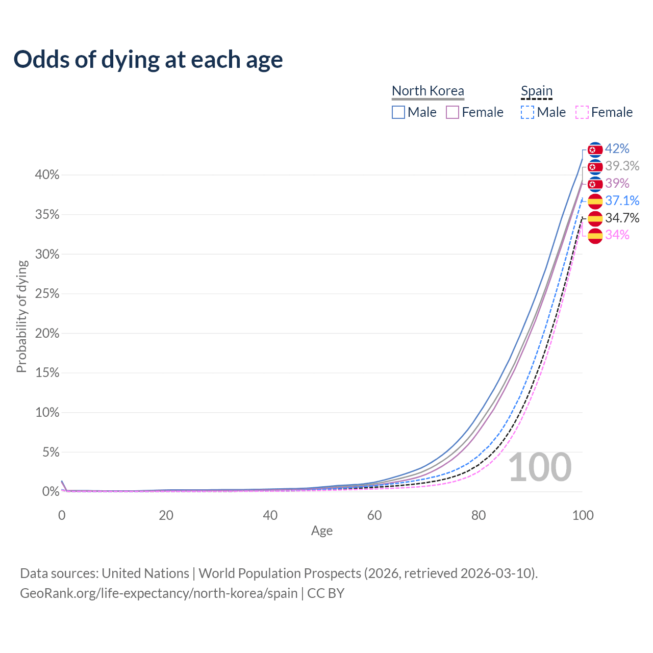 This life expectancy calculator shows the odds of living to 100, 95, 90, and below based on current age for both males and females in North Korea and Spain, along with mean and median age of death. The calculations are based on the 2026 life tables (actuarial tables) from the UN World Population Prospects.