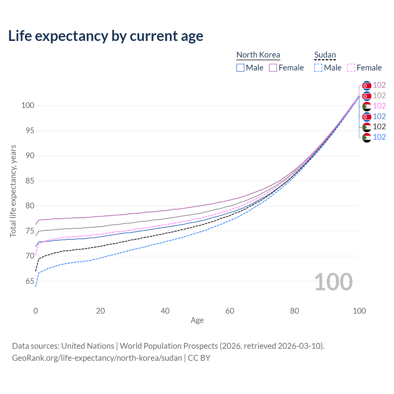 This life expectancy calculator shows the odds of living to 100, 95, 90, and below based on current age for both males and females in North Korea and Sudan, along with mean and median age of death. The calculations are based on the 2026 life tables (actuarial tables) from the UN World Population Prospects.