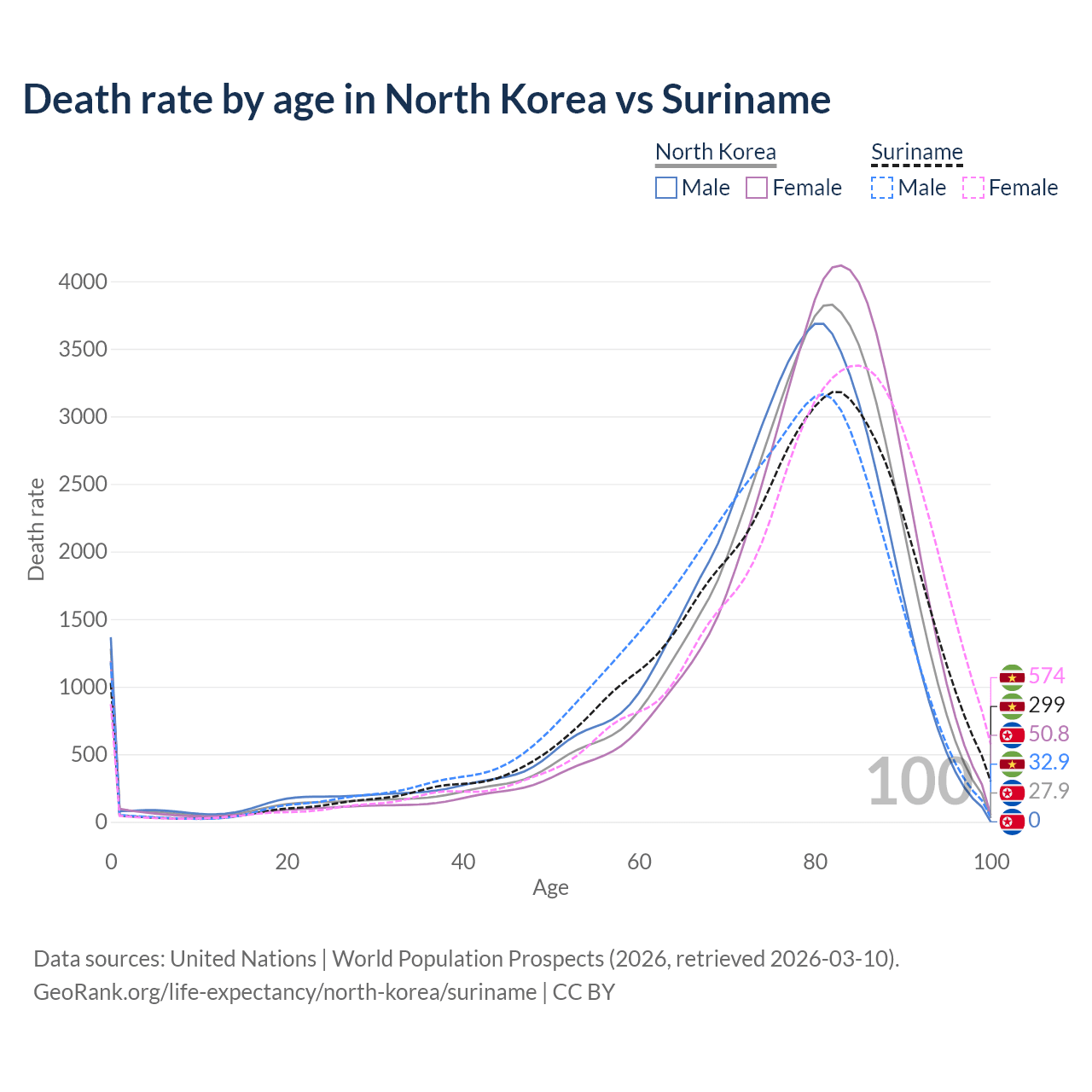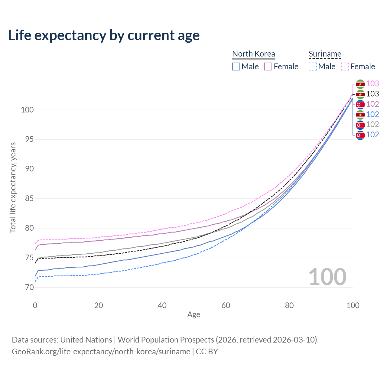 This life expectancy calculator shows the odds of living to 100, 95, 90, and below based on current age for both males and females in North Korea and Suriname, along with mean and median age of death. The calculations are based on the 2026 life tables (actuarial tables) from the UN World Population Prospects.
