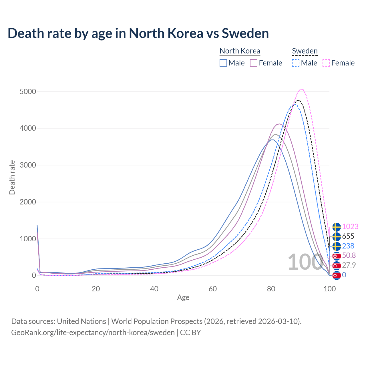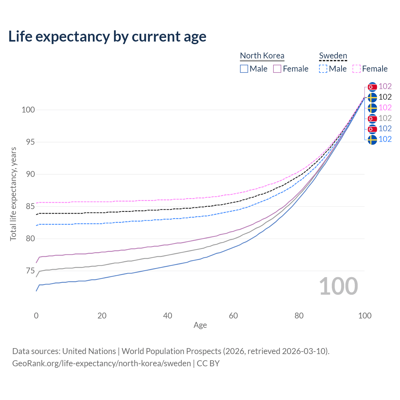 This life expectancy calculator shows the odds of living to 100, 95, 90, and below based on current age for both males and females in North Korea and Sweden, along with mean and median age of death. The calculations are based on the 2026 life tables (actuarial tables) from the UN World Population Prospects.