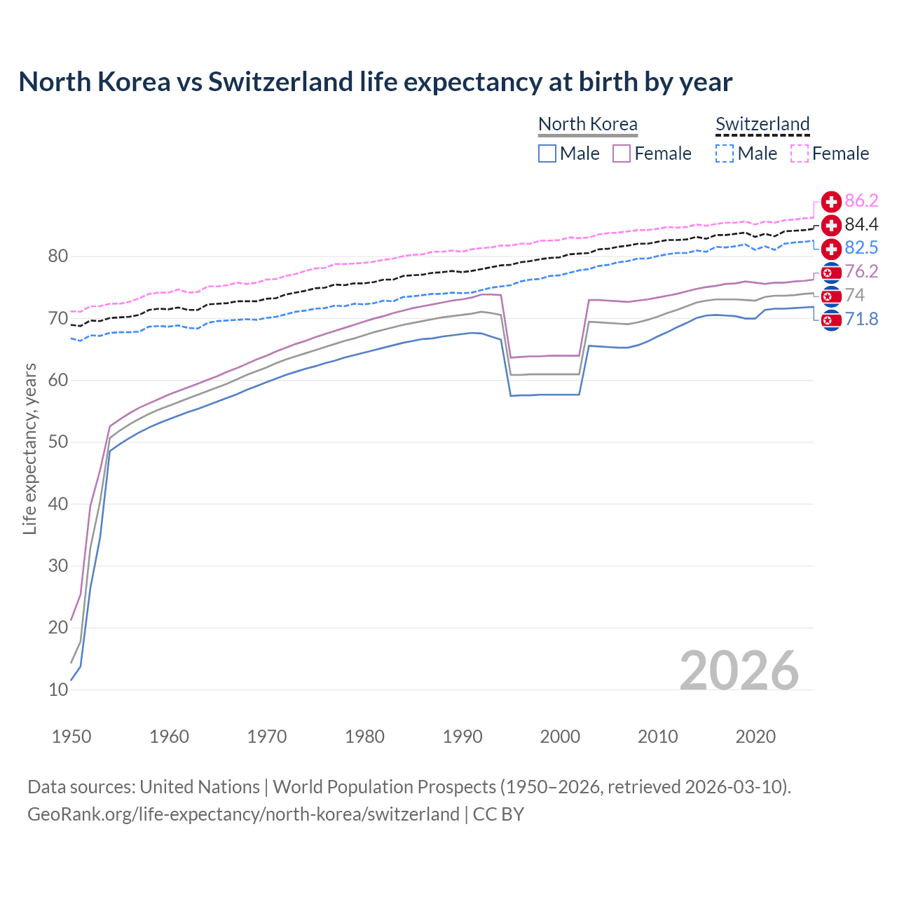 The average life expectancy at birth is 74 years in North Korea vs 84.4 in Switzerland. North Korea is ranked 104/197 by life expectancy, and Switzerland is 6/197. In North Korea, the life expectancy is 71.8 years for males and 76.2 years for females. In Switzerland, it's 82.5 years for males and 86.2 years for females.