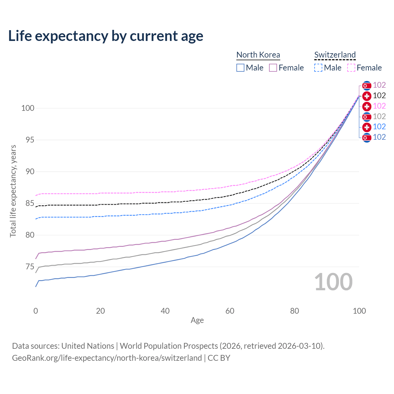 This life expectancy calculator shows the odds of living to 100, 95, 90, and below based on current age for both males and females in North Korea and Switzerland, along with mean and median age of death. The calculations are based on the 2026 life tables (actuarial tables) from the UN World Population Prospects.