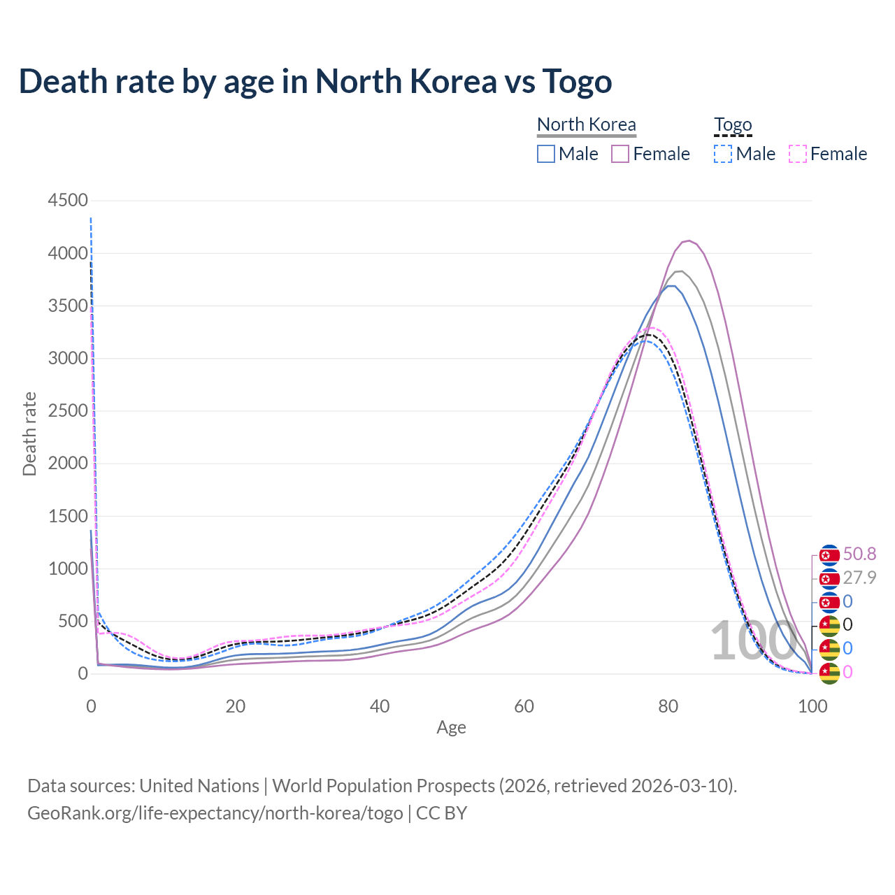 In North Korea, the most common age of death is 82, compared to 0 in Togo. The median age of death is 78.5 in North Korea and 71 in Togo, meaning only half of each cohort is expected to live past that age.