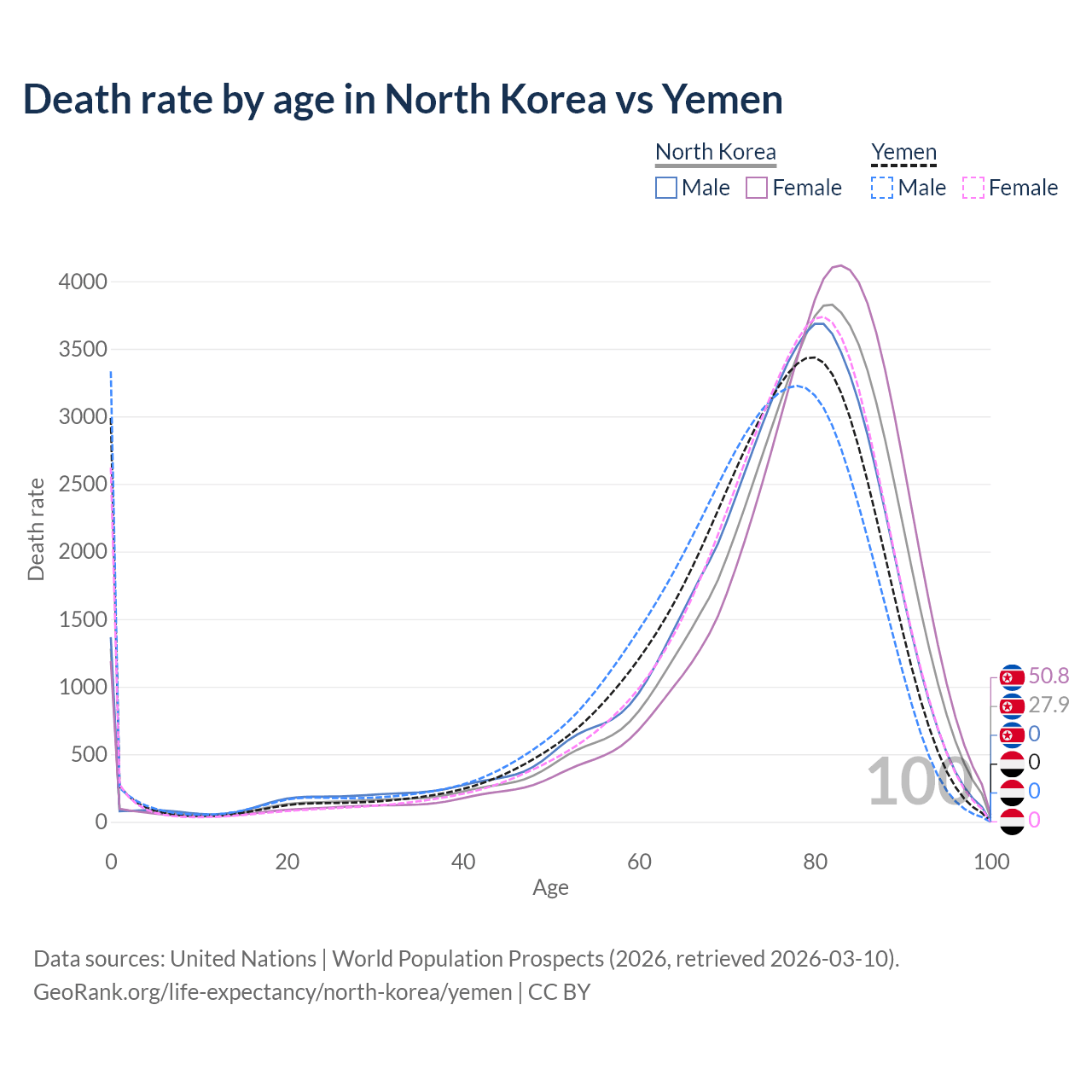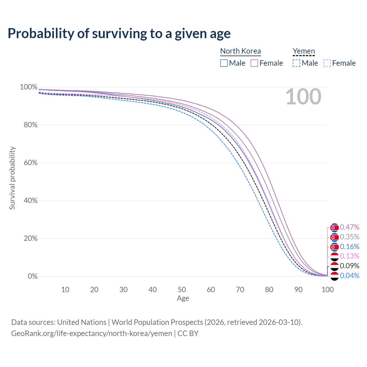 This life expectancy calculator shows the odds of living to 100, 95, 90, and below based on current age for both males and females in North Korea and Yemen, along with mean and median age of death. The calculations are based on the 2026 life tables (actuarial tables) from the UN World Population Prospects.