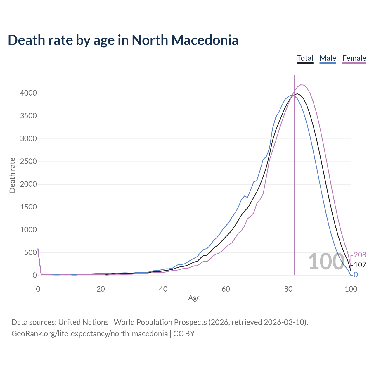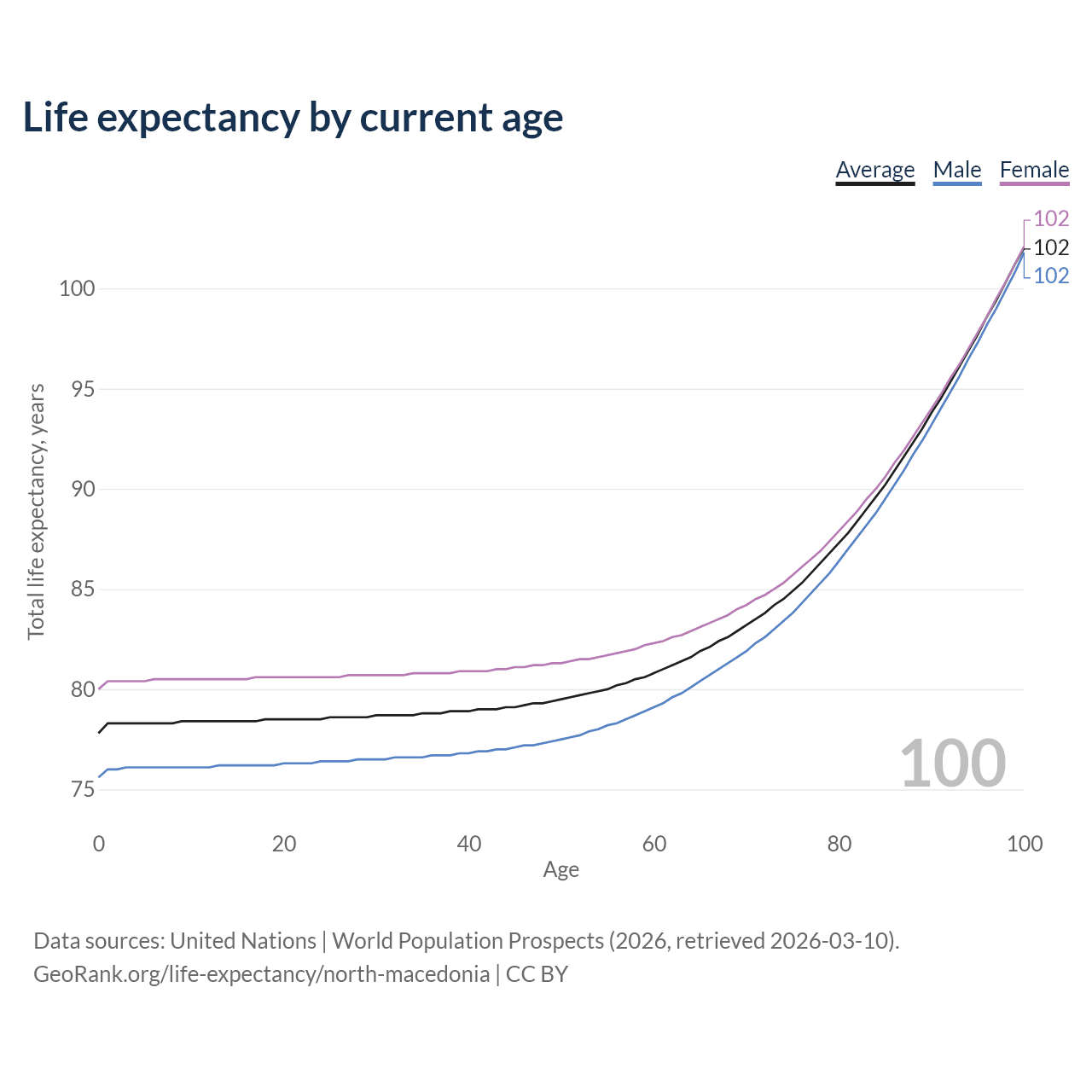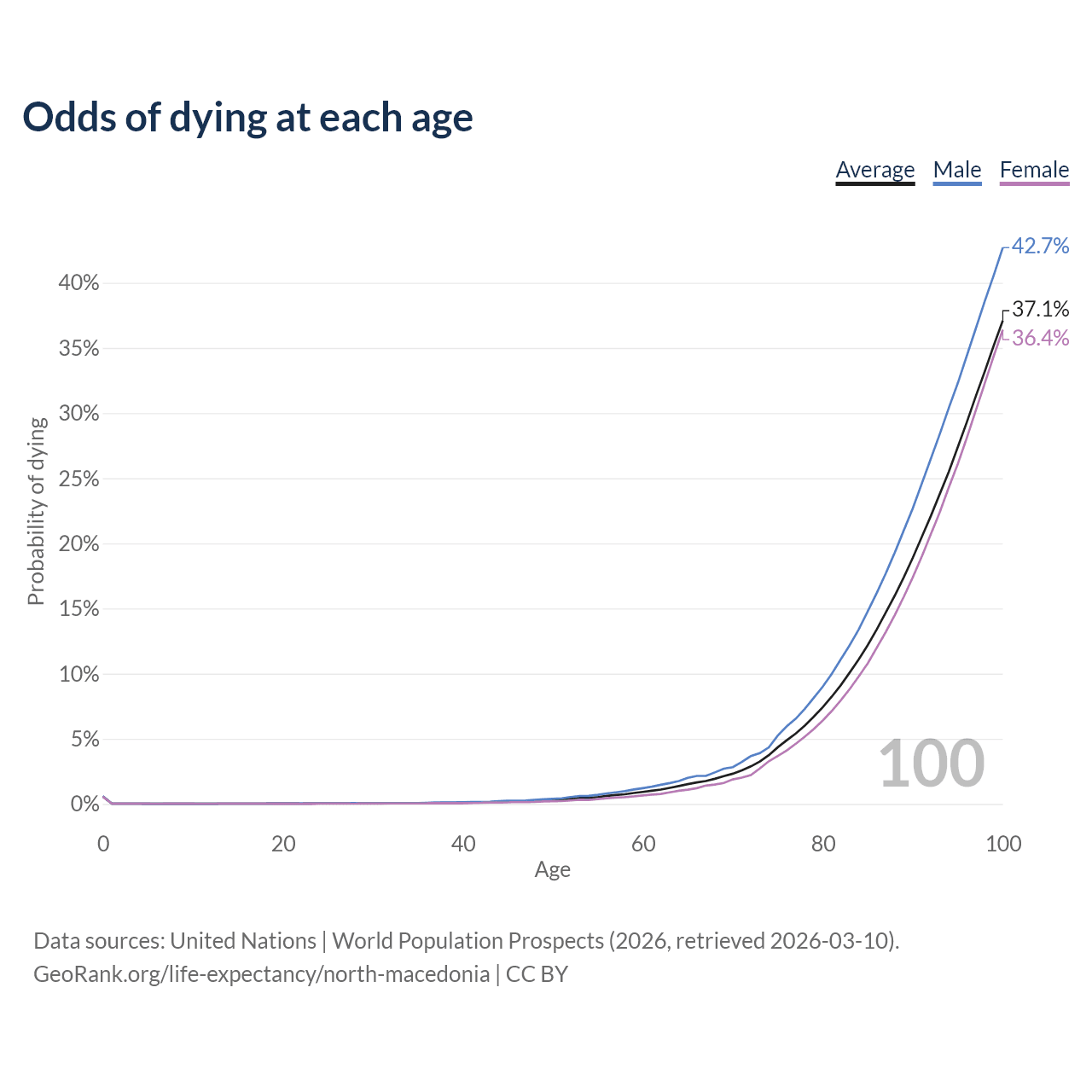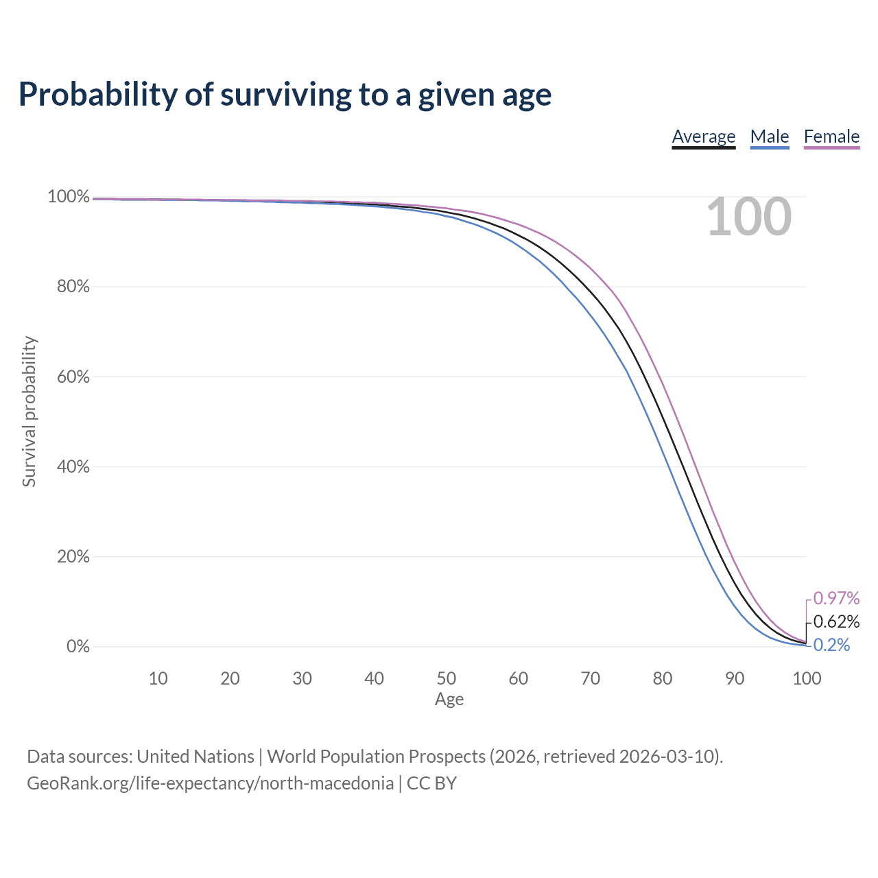 This life expectancy calculator shows the odds of living to 100, 95, 90, and below based on current age for both males and females in North Macedonia, along with mean and median age of death. The calculations are based on the 2026 life tables (actuarial tables) from the UN World Population Prospects.