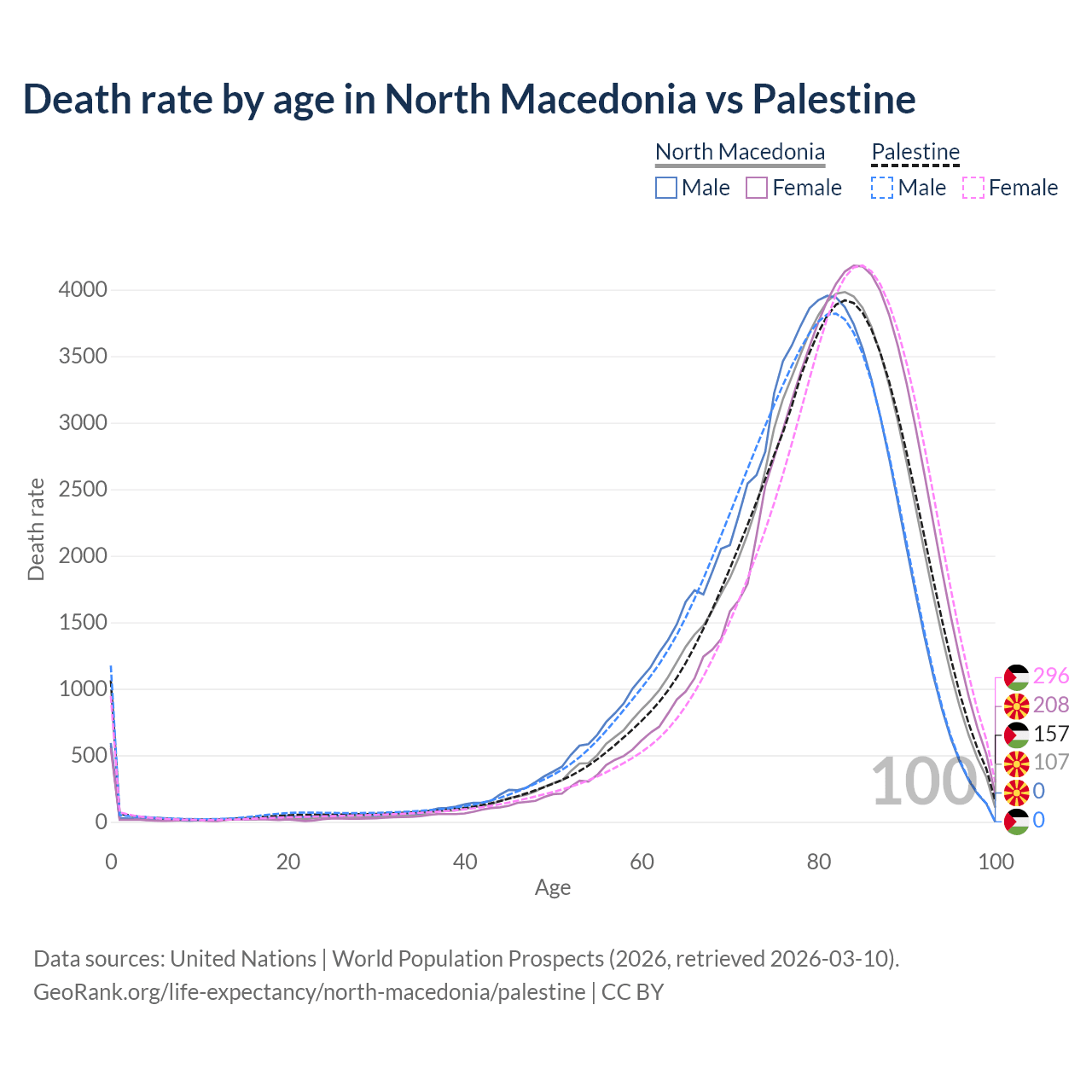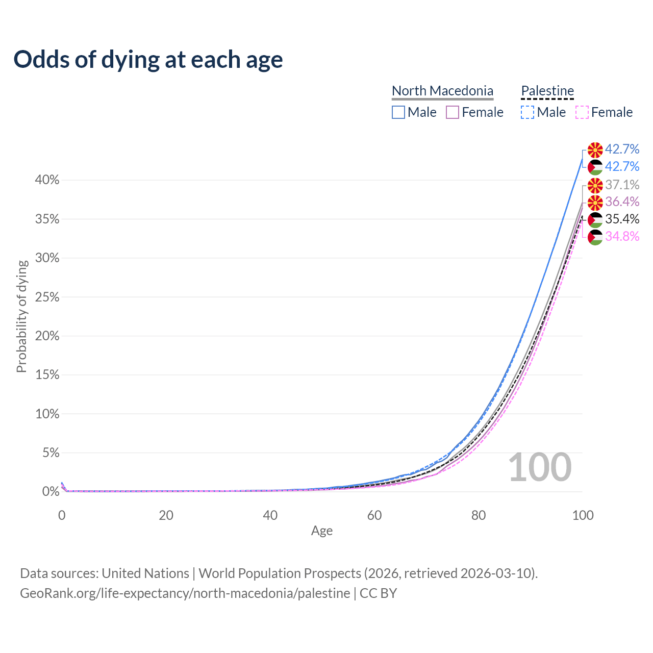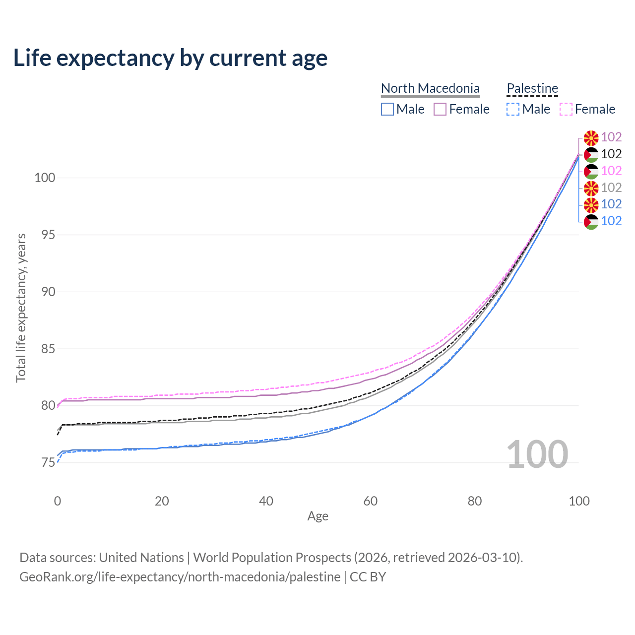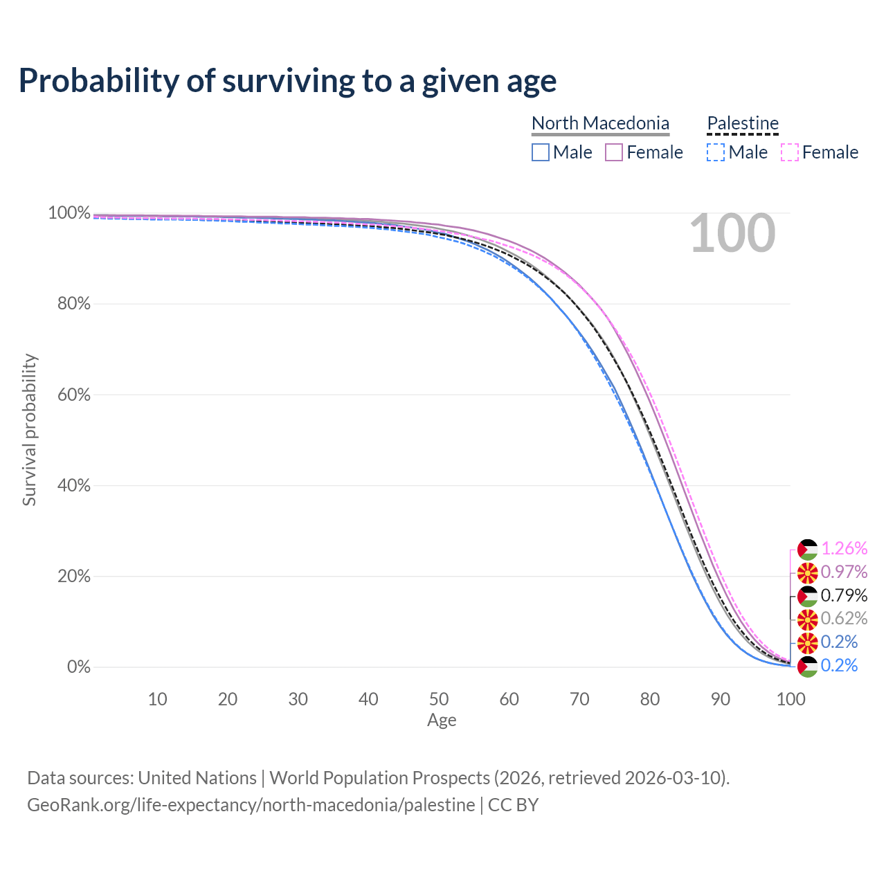 This life expectancy calculator shows the odds of living to 100, 95, 90, and below based on current age for both males and females in North Macedonia and Palestine, along with mean and median age of death. The calculations are based on the 2026 life tables (actuarial tables) from the UN World Population Prospects.