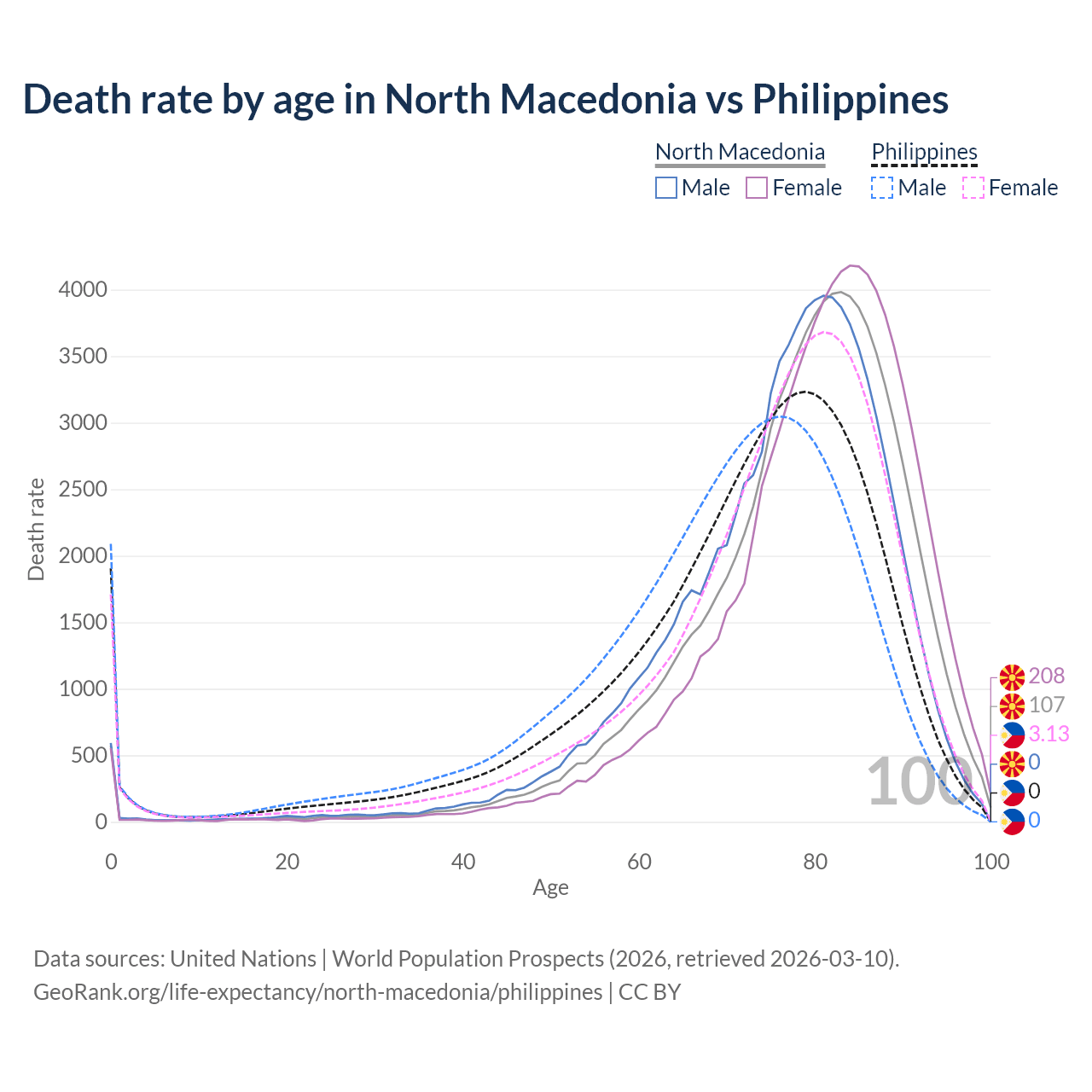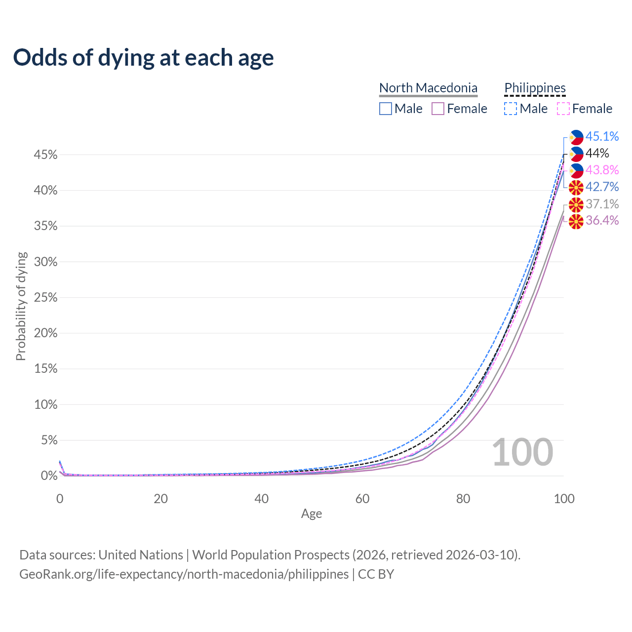 This life expectancy calculator shows the odds of living to 100, 95, 90, and below based on current age for both males and females in North Macedonia and the Philippines, along with mean and median age of death. The calculations are based on the 2026 life tables (actuarial tables) from the UN World Population Prospects.
