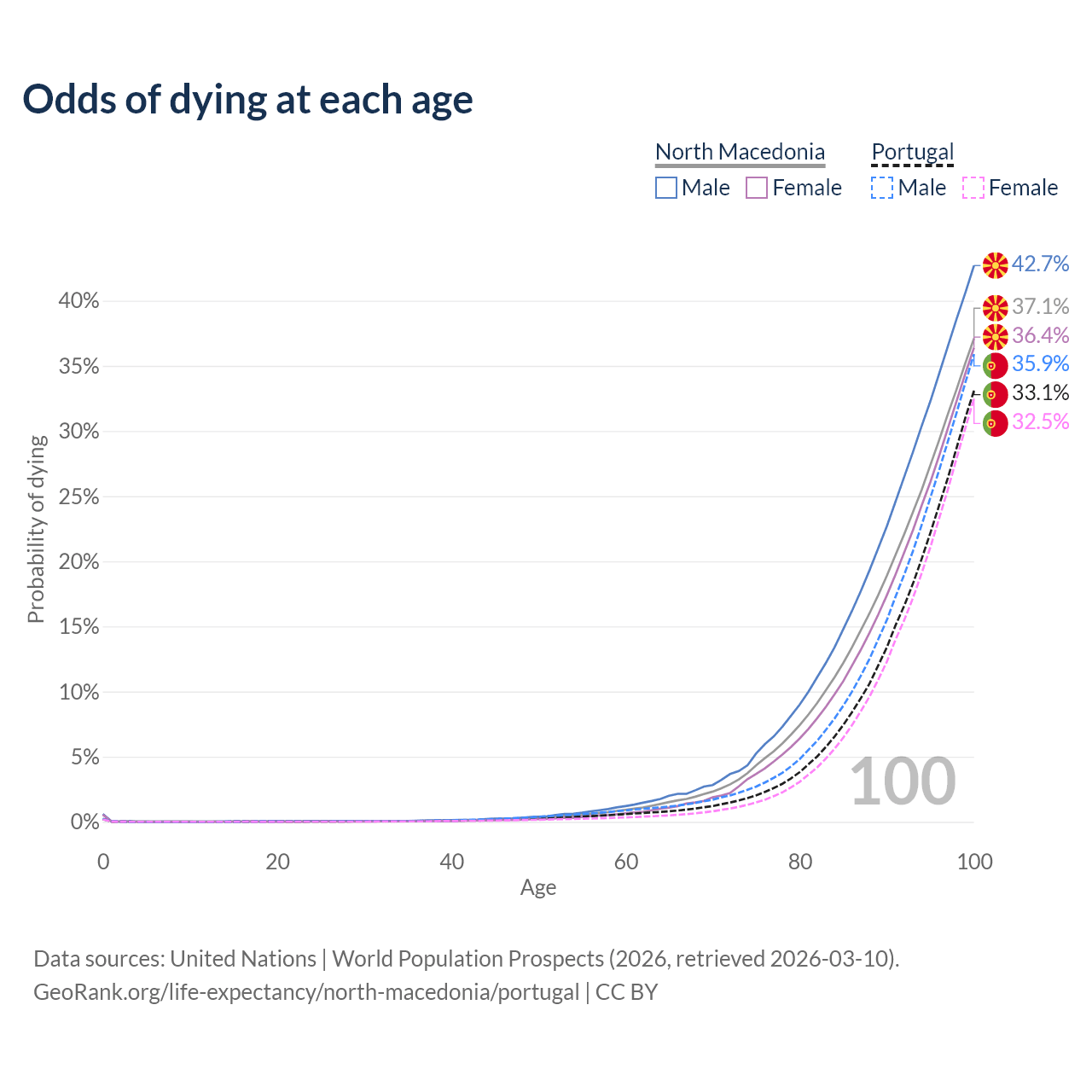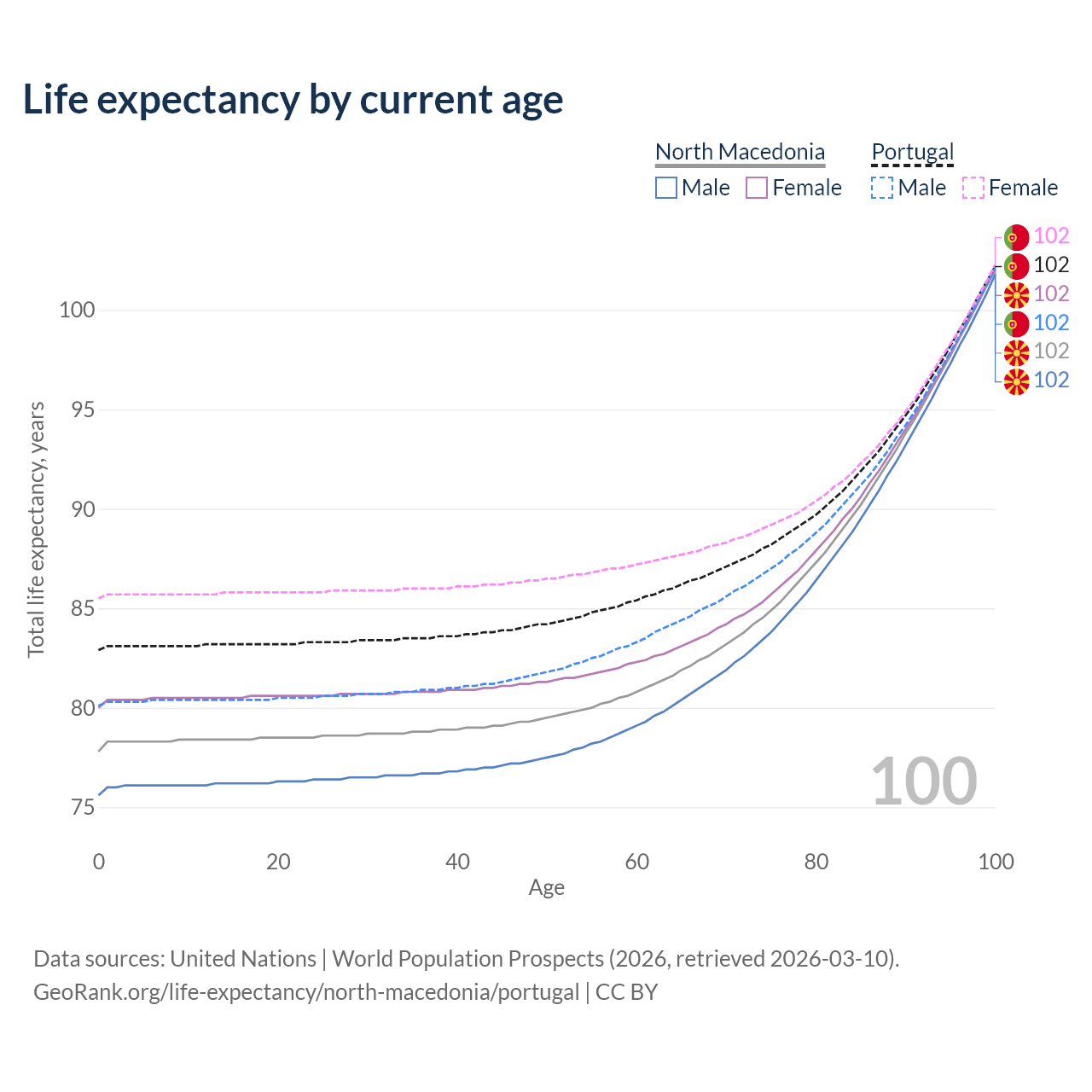 This life expectancy calculator shows the odds of living to 100, 95, 90, and below based on current age for both males and females in North Macedonia and Portugal, along with mean and median age of death. The calculations are based on the 2026 life tables (actuarial tables) from the UN World Population Prospects.