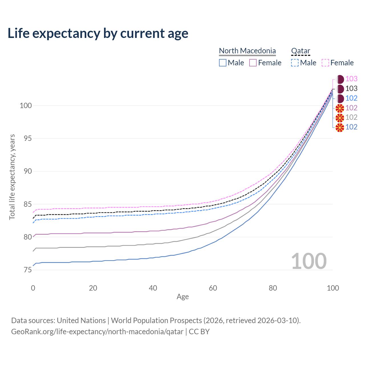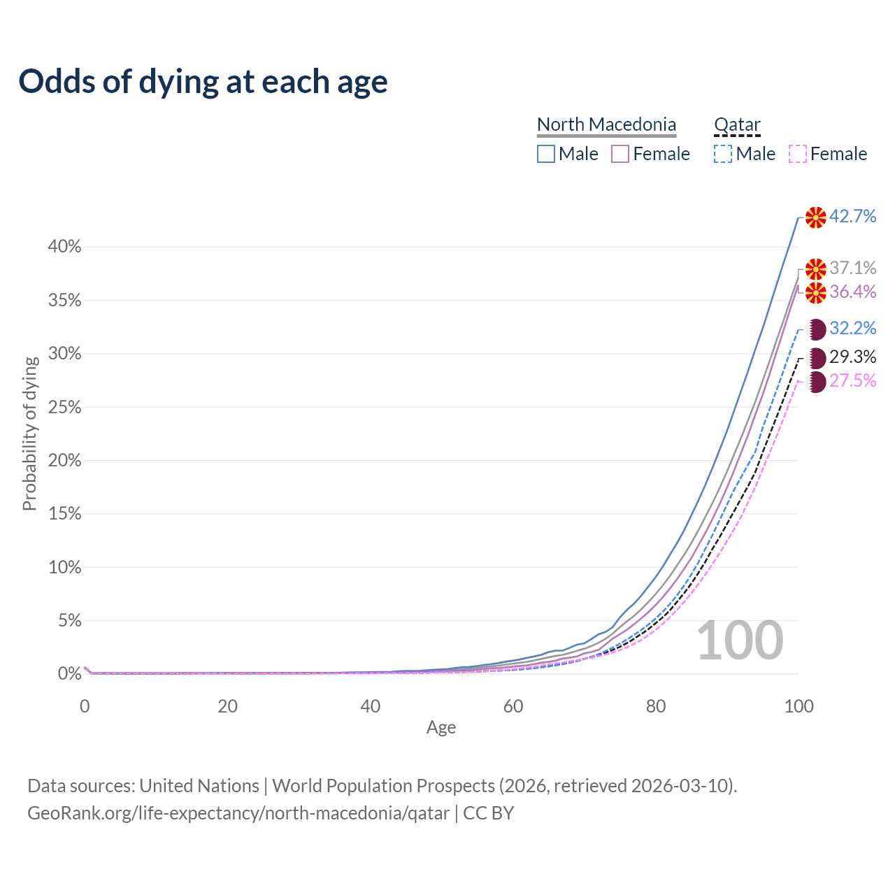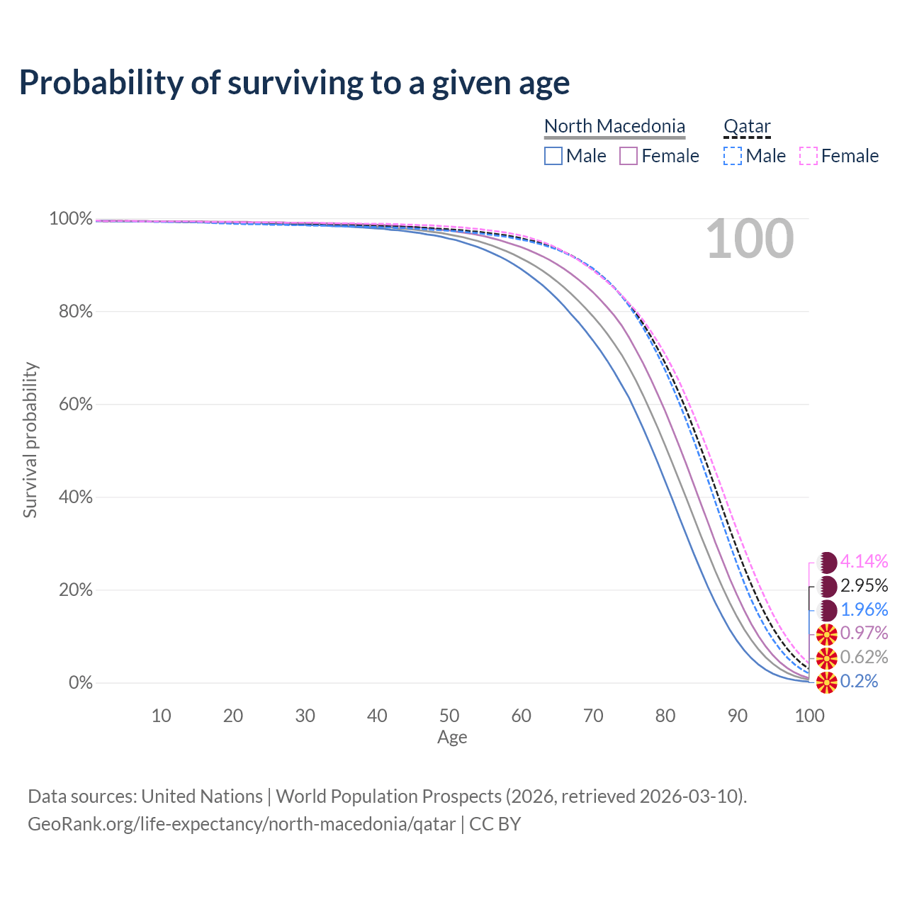 This life expectancy calculator shows the odds of living to 100, 95, 90, and below based on current age for both males and females in North Macedonia and Qatar, along with mean and median age of death. The calculations are based on the 2026 life tables (actuarial tables) from the UN World Population Prospects.