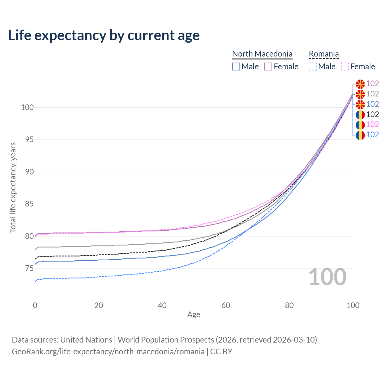 This life expectancy calculator shows the odds of living to 100, 95, 90, and below based on current age for both males and females in North Macedonia and Romania, along with mean and median age of death. The calculations are based on the 2026 life tables (actuarial tables) from the UN World Population Prospects.