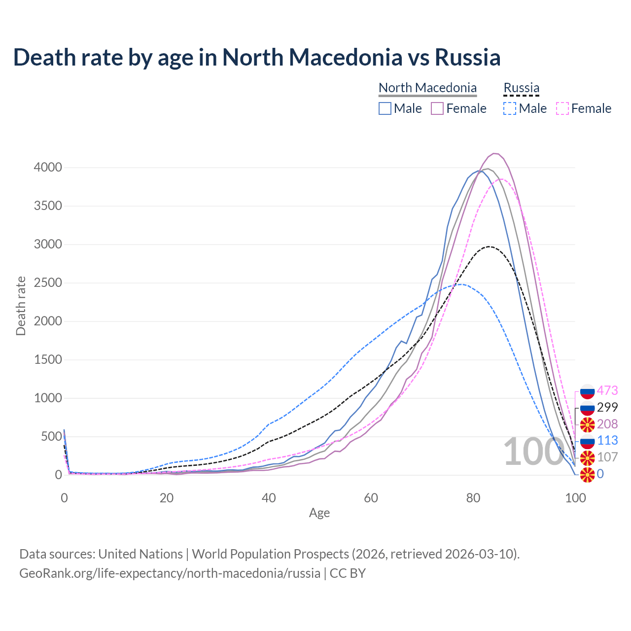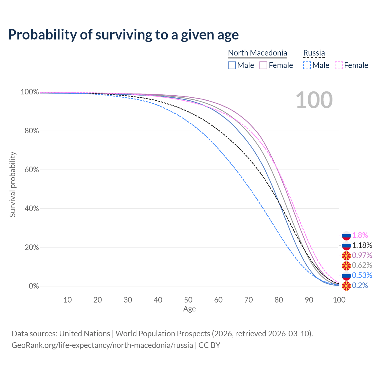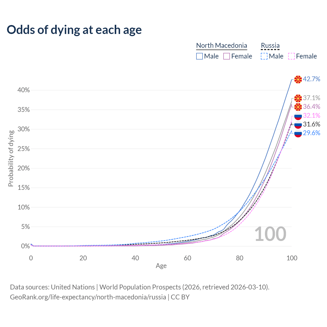 This life expectancy calculator shows the odds of living to 100, 95, 90, and below based on current age for both males and females in North Macedonia and Russia, along with mean and median age of death. The calculations are based on the 2026 life tables (actuarial tables) from the UN World Population Prospects.