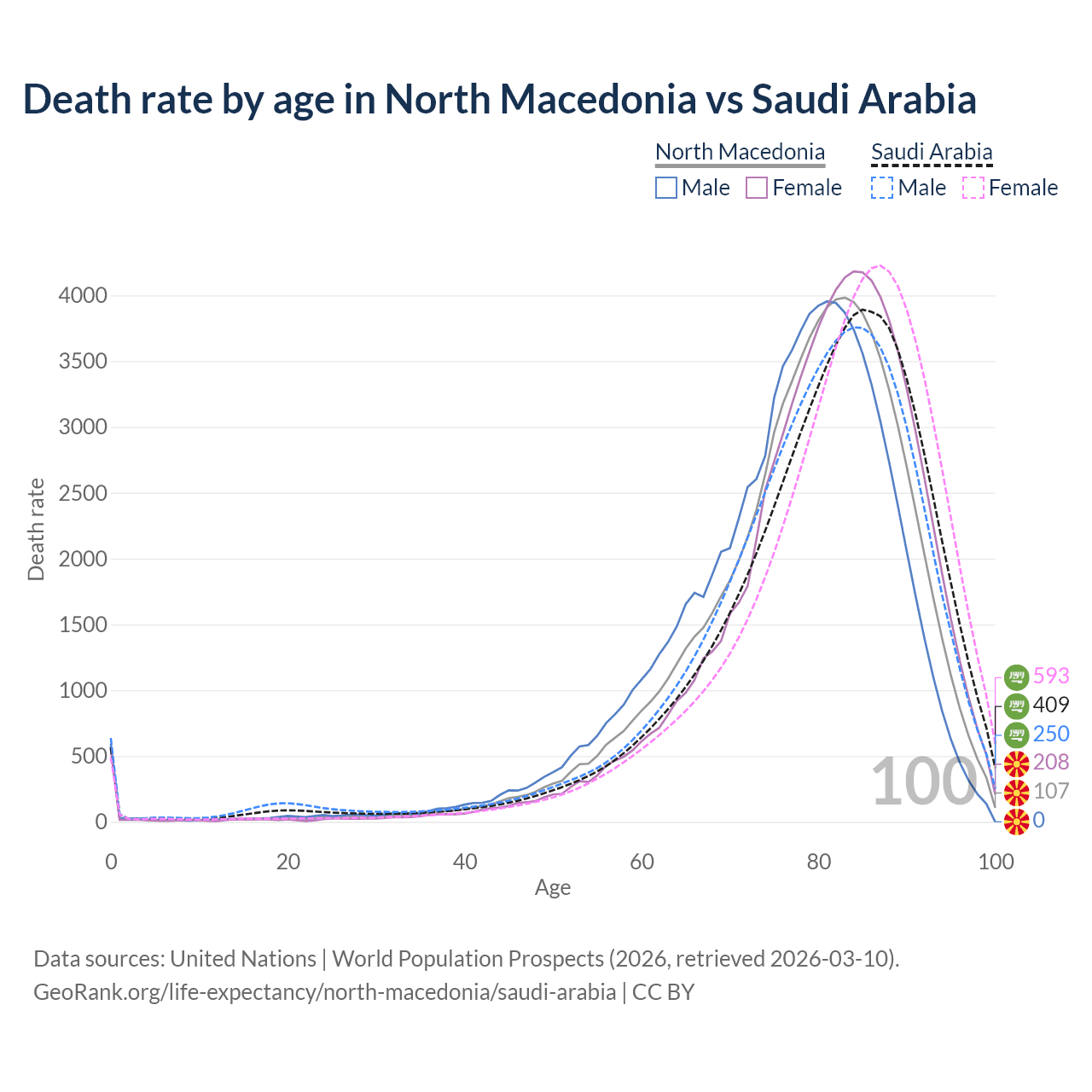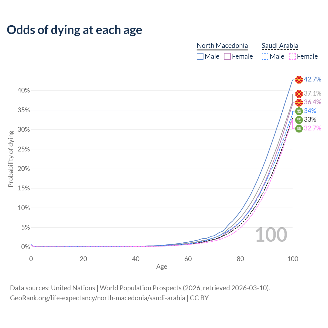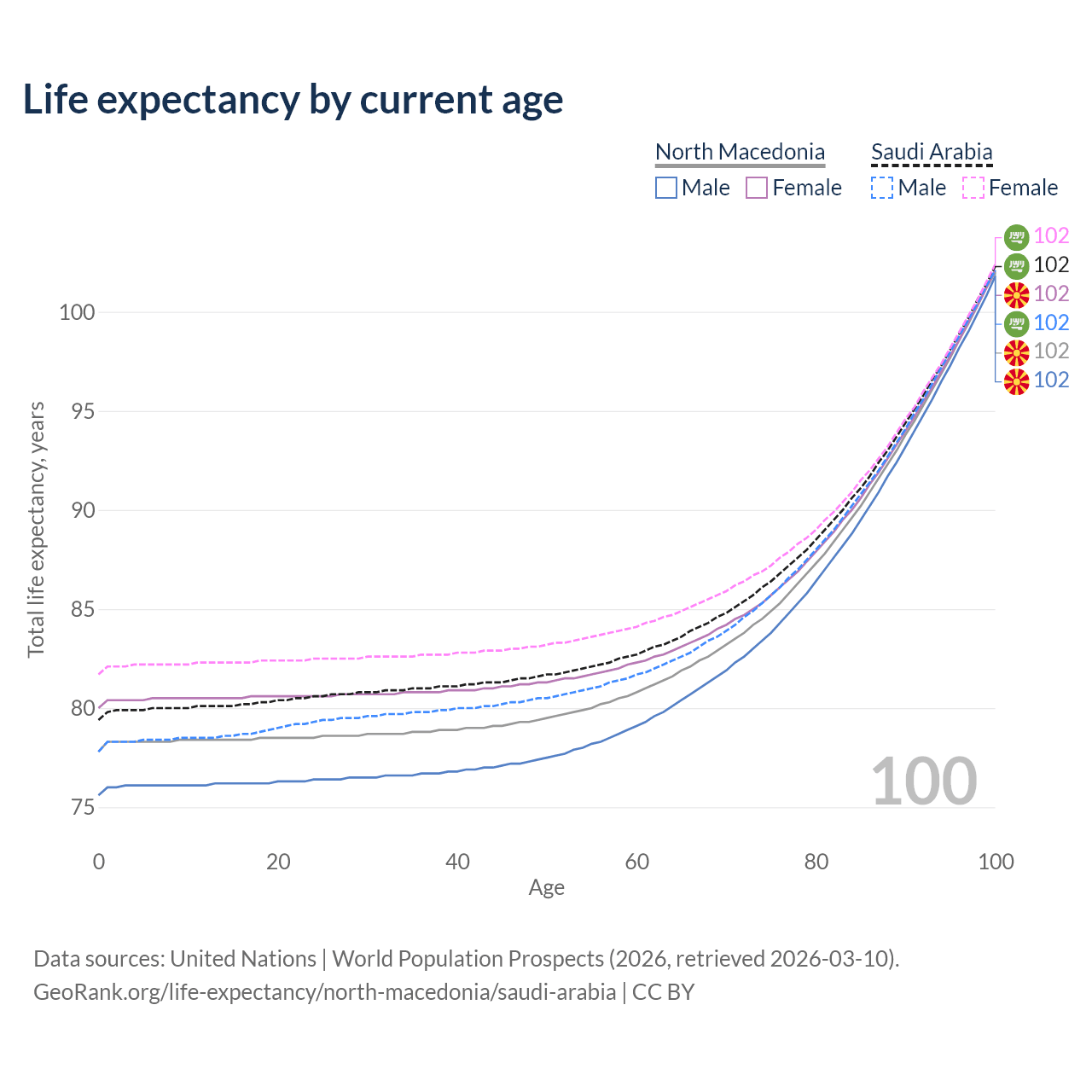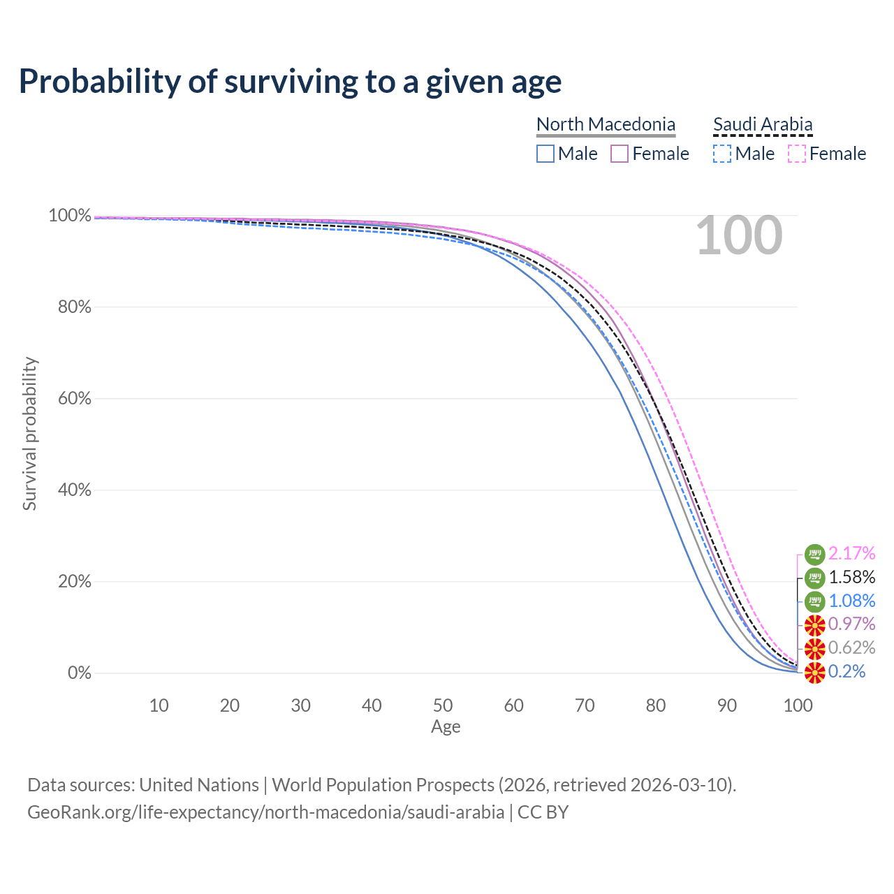 This life expectancy calculator shows the odds of living to 100, 95, 90, and below based on current age for both males and females in North Macedonia and Saudi Arabia, along with mean and median age of death. The calculations are based on the 2026 life tables (actuarial tables) from the UN World Population Prospects.
