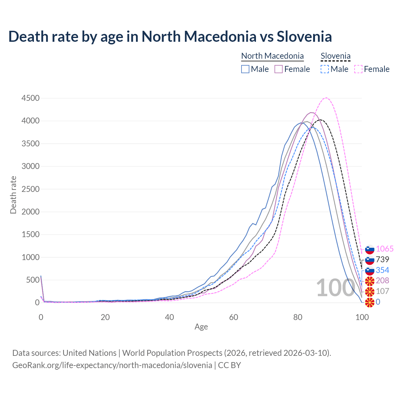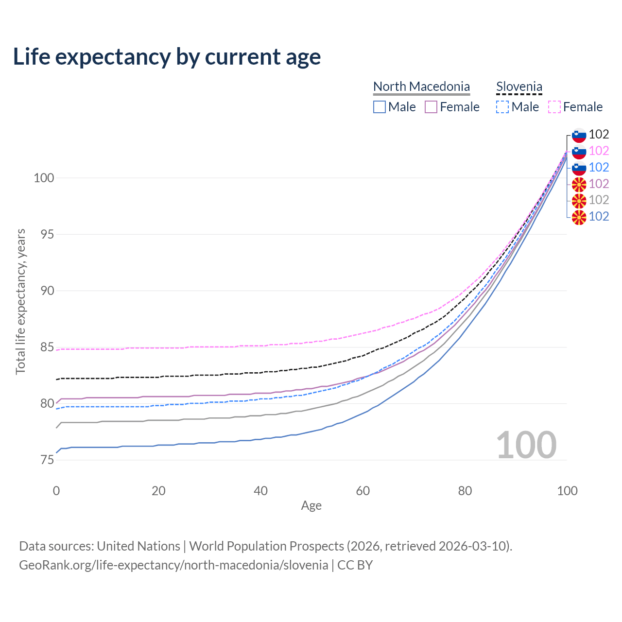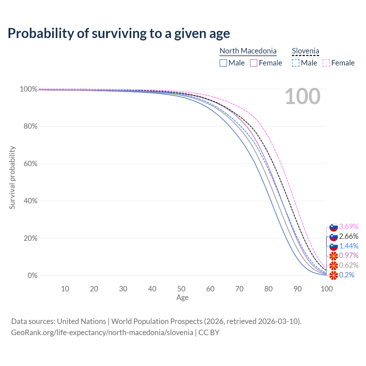 This life expectancy calculator shows the odds of living to 100, 95, 90, and below based on current age for both males and females in North Macedonia and Slovenia, along with mean and median age of death. The calculations are based on the 2026 life tables (actuarial tables) from the UN World Population Prospects.