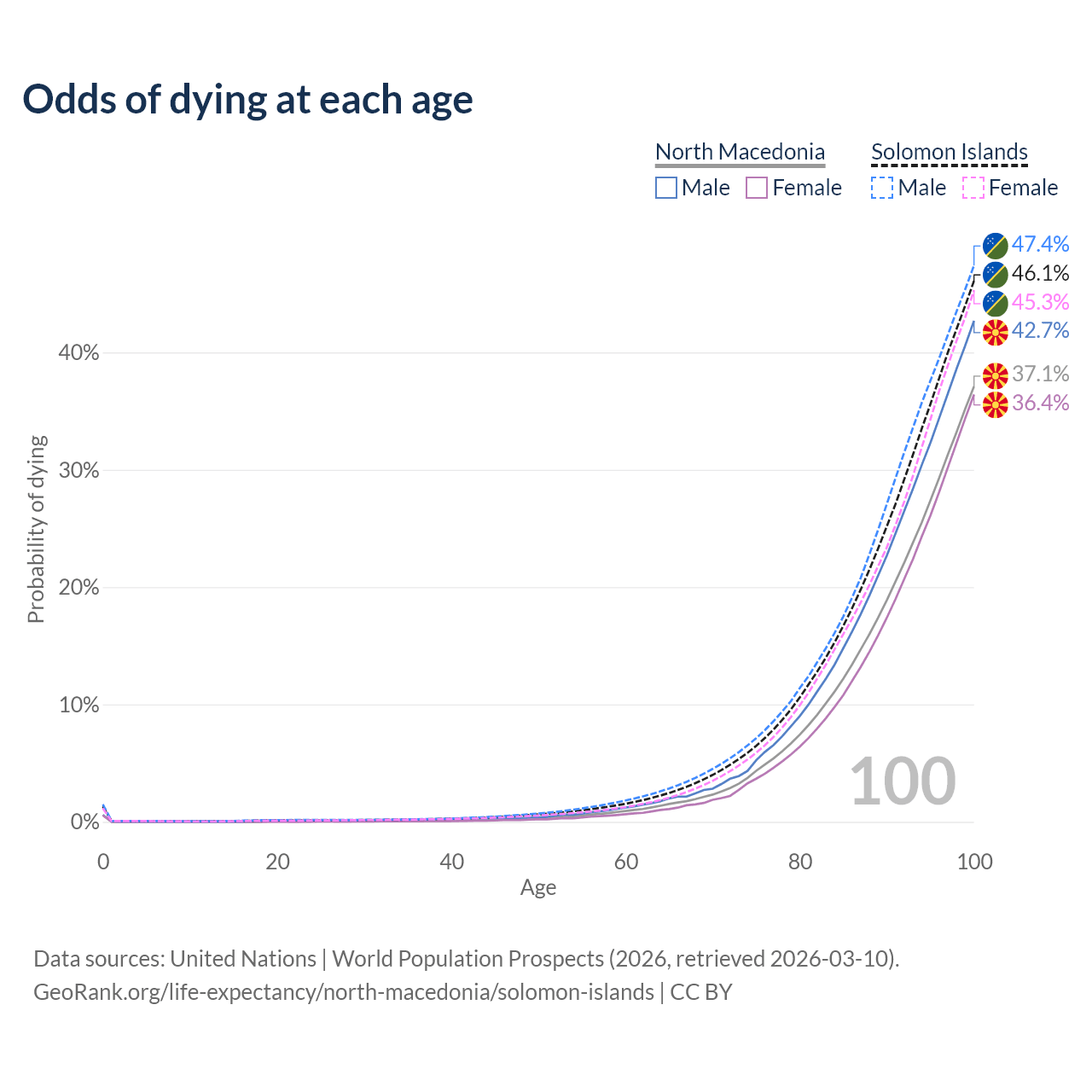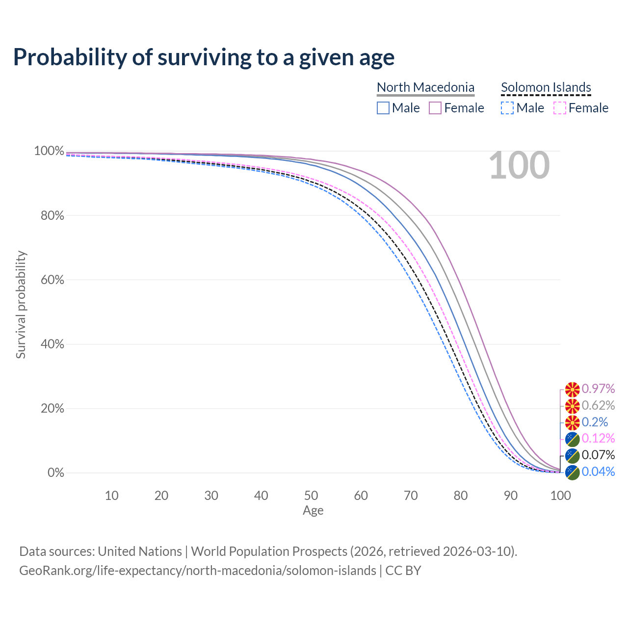 This life expectancy calculator shows the odds of living to 100, 95, 90, and below based on current age for both males and females in North Macedonia and the Solomon Islands, along with mean and median age of death. The calculations are based on the 2026 life tables (actuarial tables) from the UN World Population Prospects.