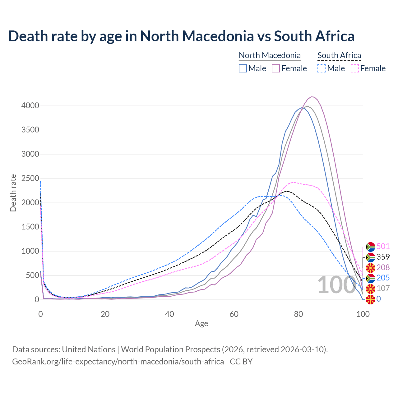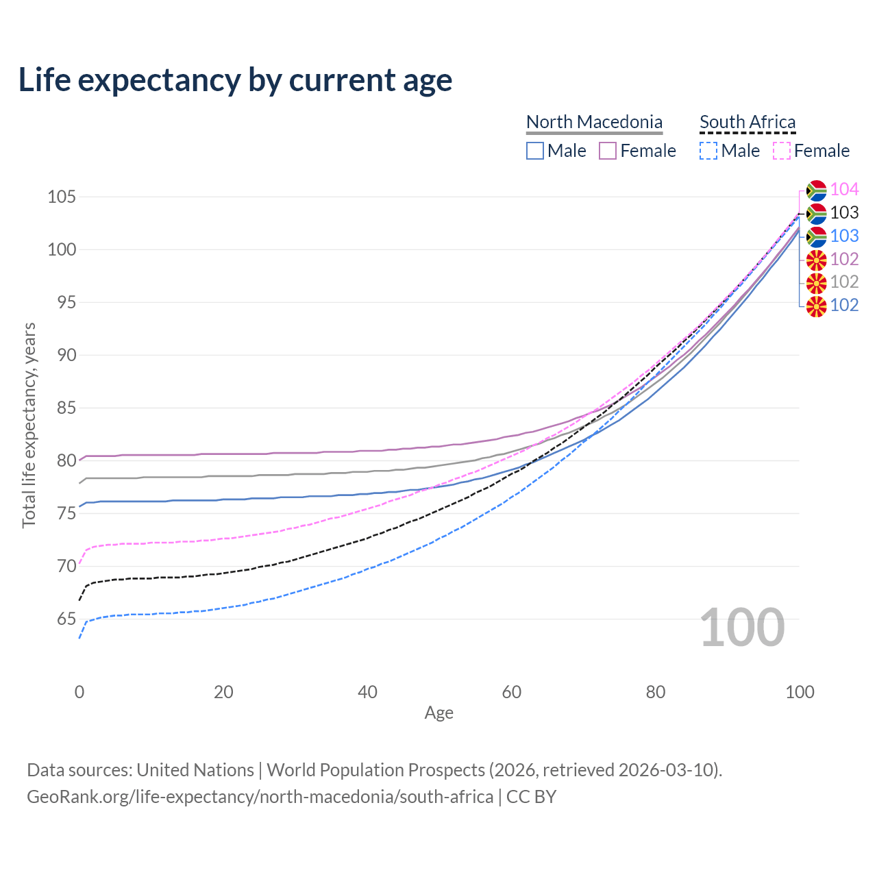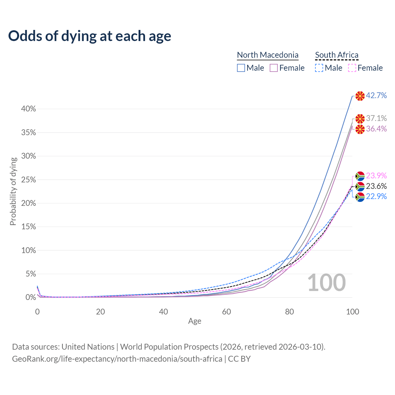 This life expectancy calculator shows the odds of living to 100, 95, 90, and below based on current age for both males and females in North Macedonia and South Africa, along with mean and median age of death. The calculations are based on the 2026 life tables (actuarial tables) from the UN World Population Prospects.