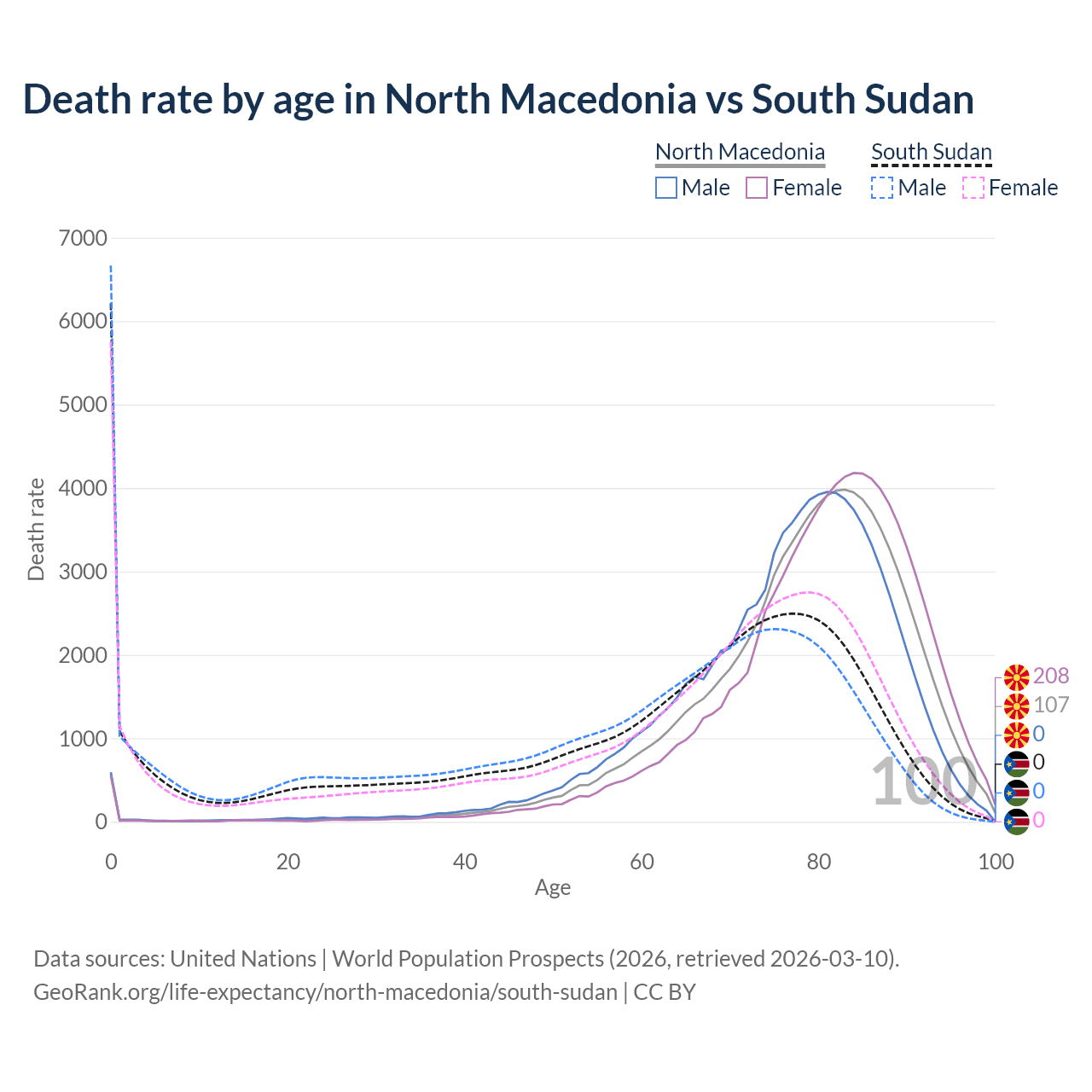 The average life expectancy at birth is 77.8 years in North Macedonia vs 58 in South Sudan. North Macedonia is ranked 67/197 by life expectancy, and South Sudan is 195/197. In North Macedonia, the life expectancy is 75.6 years for males and 80 years for females. In South Sudan, it's 55 years for males and 61 years for females.