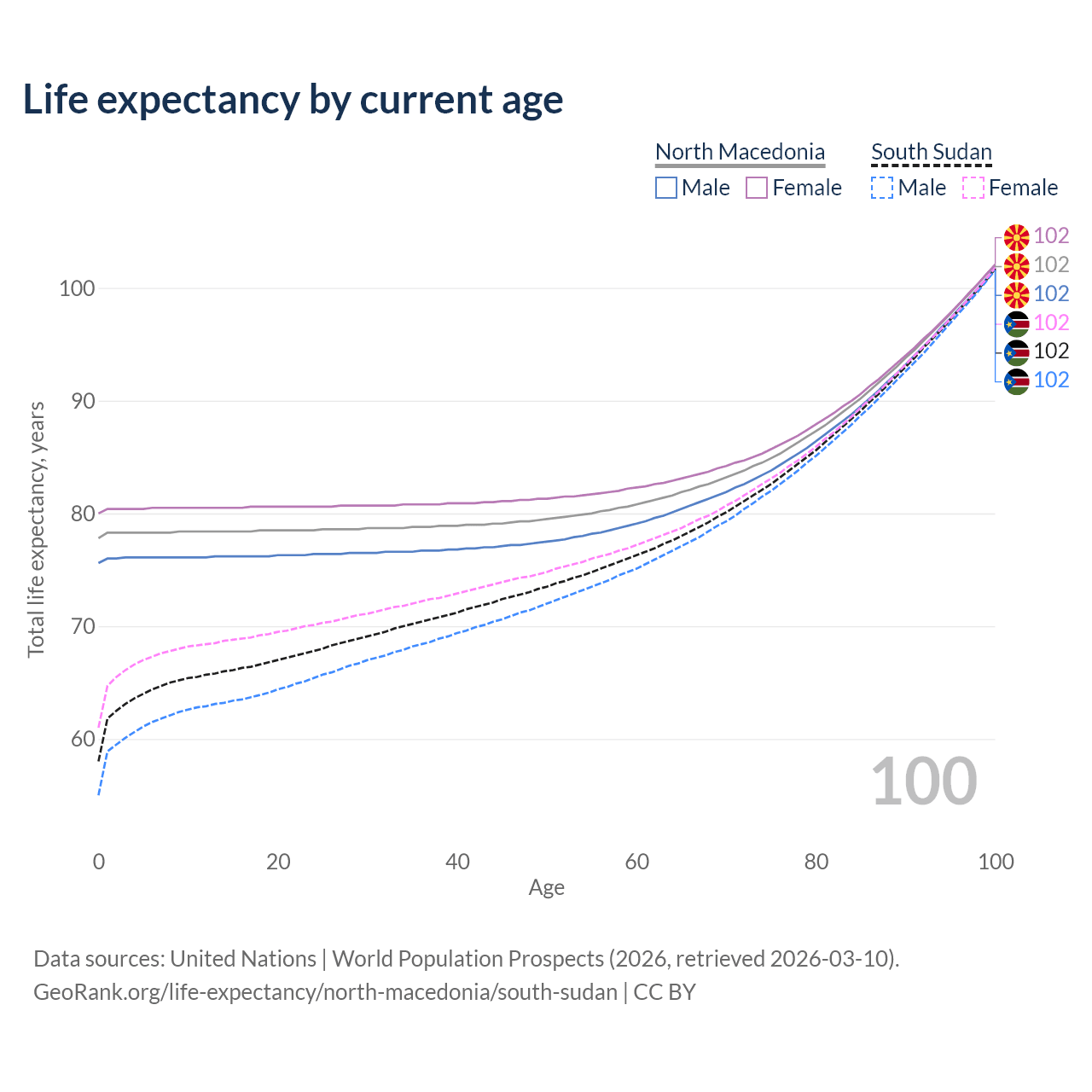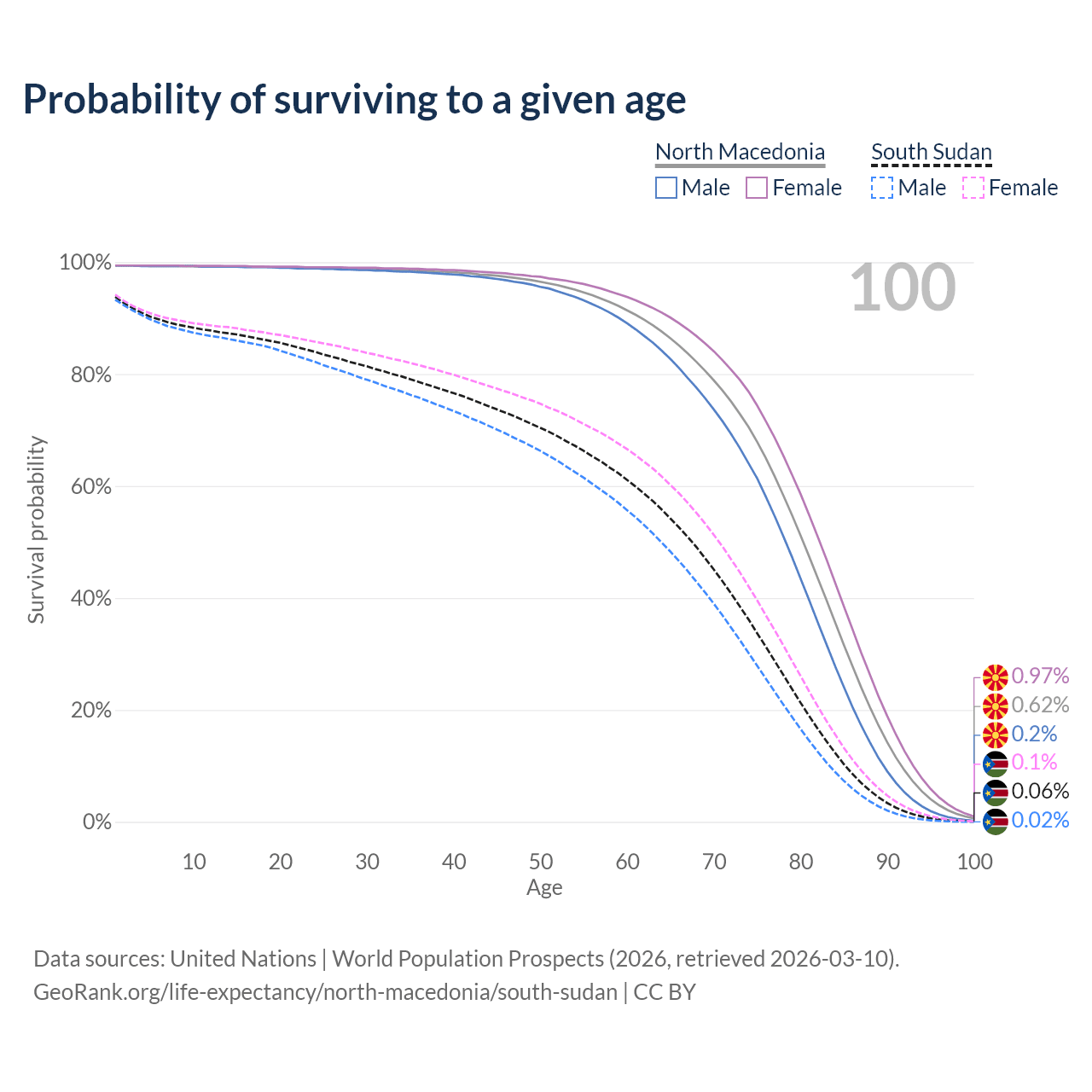 This life expectancy calculator shows the odds of living to 100, 95, 90, and below based on current age for both males and females in North Macedonia and South Sudan, along with mean and median age of death. The calculations are based on the 2026 life tables (actuarial tables) from the UN World Population Prospects.